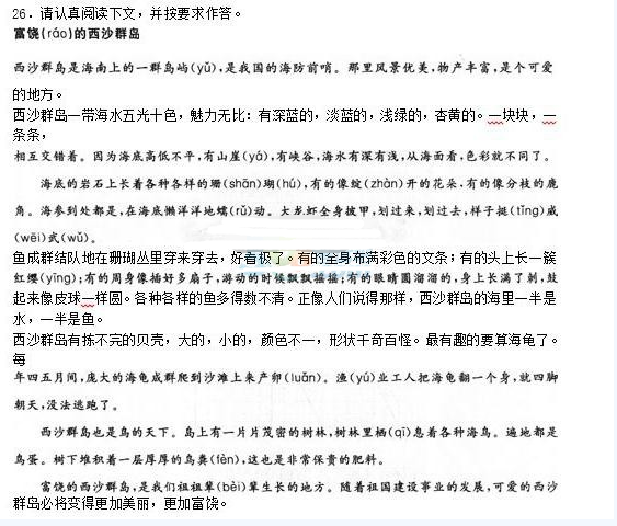 解析 【参考设计】   问题(一):这篇课文用了总分总的写作方法,按照海面、海底、海滩、海岛的顺序介绍了风光和物产。   问题(二):   1.教学目标   (1)知识与技能目标:能正确、流利、有感情地朗读课文;读懂课文主要内容,了解西沙群岛是个美丽、富饶的地方;收集文中的好词佳句,并背诵课文中自己喜欢的部分。   (2)过程与方法目标:通过读,了解课文是从海水、海底、海滩、海岛四个方面来介绍西沙群岛的;有感情地朗读,从中体会西沙群岛是个风景优美、物产丰富的地方。   (3)情感态度与价值观目标:感受西沙群岛风光的美丽,激发热爱祖国大好河山的思想感情。   2.教学重点   学习描写海水色彩和海域物产的段落。   问题(三):   第一课时   一、直观导入,激发兴趣   1.课件出示:西沙群岛的地图。   师:在距离海南岛180多海里的东南海面上,有一片岛屿像朵朵星莲、颗颗珍珠浮于万顷碧波之中,那就是令人向往而又充满神秘色彩的西沙群岛。   板书:西沙群岛   2.揭示课题:今天,我们就一起去参观参观富饶的西沙群岛。   板书:富饶的(学生齐读课题)   二、初读课文,整体感知   1.检查初读情况。   2.检查学生的识字情况:出示“我会认”的10个生字和“我会写”的13个生字,通过多种形式认字:集体认读、开火车读、男女比赛读、编谜语、组词、造句、找反义词、找近义词等,帮助学生识记生字。   3.指导学生抓住“富”“饶”理解文章。   师:“富”和“饶”都是很多的意思,那么西沙群岛什么“多”呢?请大家打开课文默读,找一找,圈一圈,按课文叙述的顺序来说一说。   三、通文顺句,深刻感悟   1.同学们刚才找得很认真,下面就让我们来交流一下富饶的西沙群岛什么多?   边交流边板书:海水、颜色、珊瑚、海参、大龙虾、鱼、贝壳、海龟、鸟、鸟蛋、鸟粪   2.教师小结:对啊,作者按照地点的变化向我们介绍了西沙群岛的海面——(海水颜色多),海底——(珊瑚、海参、大龙虾、鱼多),海滩——(贝壳、海龟多),海岛上——(鸟、鸟蛋、鸟粪多),并且在介绍的过程中紧紧抓住了它们的特点,使得这些景物栩栩如生地展现在我们面前。   随机板书:站在海边、潜入海底、漫步海滩、登上鸟岛   3.过渡:下面就让我们去细细欣赏这些美丽的景物吧!   四、深情朗读,感情升华   1.课件出示风景图:   西沙群岛一带海水五光十色,瑰丽无比:有深蓝的,淡蓝的,浅绿的,杏黄的。一块块,一条条,相互交错着。   请大家自由朗读这句描写海水的句子。   2.指导朗读:哪位同学能用朗读来表现海水的瑰丽?   读后学生点评。   3.全班齐读。   4.教师引读。   (教师读)西沙群岛一带海水五光十色,瑰丽无比:   请同学们看着课件接读。   5.师生合作读:为什么会出现这么美丽的景象呢?   教师一边用鼠标点图,一边引读:因为海底高低不平,有山崖,有峡谷,海水有深有浅——   学生接读:(所以),从海面看,色彩就不同了。   6.指导背诵。   五、教师小结,结束新课   六、作业设计   摘抄课文中的好词佳句。   第二课时   一、回顾课文,复习导入   1.回忆上节课所学内容。   上节课我们已经跟随作者的描述,初步感受了西沙群岛。回忆一下,西沙群岛在你的印象中是怎么样的?你能以“啊——”为开头,并用课文中“风景优美、物产丰富”两个词语来感慨一下吗?   板书:风景优美、物产丰富   2.朗读课文中心句:是啊,西沙群岛风景优美,物产丰富,真是个可爱的地方。   3.小结作者描写的顺序:那么,作者是怎样描写西沙群岛风景优美、物产丰富的呢?先后描写了什么地方?   板书:站在海边、潜入海底、漫步海滩、登上乌岛   4.引读第2自然段:西沙群岛一带的海水——   小结:是啊,那海水犹如一匹巨大的七彩锦缎铺展在人们眼前,令人叹为观止。这节课让我们再次踏上西沙群岛,去感受她的美丽和富饶吧。同学们,接下来,你们最想潜入海底,或是漫步海滩,还是登上鸟岛呢?选你最想到的地方,有滋有味地读起来吧。(师巡视)   二、指导学习3、4自然段:潜入海底   1.快速默读3、4自然段,你在海底看见了哪些生物?用下划线标出来。   2.指名回答。   3.精读第3自然段,感受珊瑚的多姿、海参的闲懒、龙虾的威武。   (1)指名朗读描写珊瑚的句子。   (2)观察课件,理解比喻句:有的像绽开的花朵,有的像分枝的鹿角。   (3)教师引导学生小结:各种各样。   把这个中心词标出来,齐读。   (4)指名朗读描写海参的句子。   (5)指导朗读。   抓住“懒洋洋地蠕动”这个词组,理解词语,结合课件感受海参的特点。   (6)表演朗读这一句。   (7)指名朗读描写大龙虾的句子。   (8)引导理解“威武”的意思。   4.精读第4自然段,感悟鱼数量多、鱼姿美。   (1)指名朗读,整体感悟鱼多、美,说说自己读后的感觉。   (2)引导理解“各种各样、数不清”。   你能用自己平时积累的其他词语来形容鱼多吗?(不计其数、不胜枚举、千姿百态……)   (3)引导理解“西沙群岛的海里一半是水,一半是鱼”。   观察课件,指导朗读,注意读出惊叹的语气。   小结:这一句采用的是夸张的写法,足以说明西沙群岛的鱼实在是品种繁多、数不胜数啊!   (4)过渡:这里的鱼不仅多,而且很美丽,很独特,作者介绍了哪几种鱼?请几个同学分别来朗读描写每一种鱼的句子。(指名朗读)   (5)学生说说自己喜欢的鱼。   (6)欣赏各种鱼的课件,深化感受,随图片朗读相应的描写鱼的