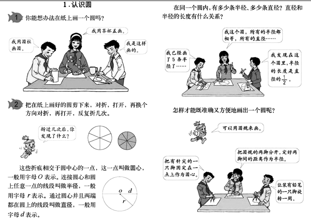 解析 (1)落实 “四基 ” ①基础知识 :本课中 ,让学生通过观察和动手操作 ,获得圆的相关知识 ,这样能够使学生牢固掌握。 ②基本技能 :学生观察圆的特点 ,在动手操作画圆的过程中锻炼观察能力与动手操作能力。 ③基本思想 :学生在探究学习中 ,通过合情推理 ,体会抽象归纳的数学思想。 ③基本活动经验 :学生通过动手操作、观察、猜测、验证、反思等活动积累数学活动的经验。 (2) 教学目标 ①知识与技能目标 :认识圆 ,理解并掌握圆心、直径、半径等概念。 ②过程与方法目标 :通过观察、思考和动手操作等活动 ,对圆有一个清晰明确的认识 ,并能借助圆规正确地画出圆 ,增强动手操作的能力。 ③情感、态度和价值观目标 :学生从生活中学到与圆相关的知识 ,体会到圆在生活中的应用及美感 ,增强学习数学的兴趣。 (3) 教学过程一、创设情境 ,导入新课展示图片 ,让同学们从图片中找出认识的图形 ,引导学生发现车轮、花坛和水池等都是圆形的 ,从而引出本节课要学的知识 ———认识圆。 二、观察思考 ,动手操作 ,对圆有个直观、明确的形象认识 (一)找一找组织学生找一找身边或生活中哪些物品是圆的。 (二)画一画 1.以小组为单位 ,讨论如何在纸上画出一个圆。 2.上台展示讨论结果 ,教师点评。 (三)折一折 1.请同学们把自己画出的圆剪下来 ,对折、打开 ,再对折、打开 ,依次重复几次 ,发现有什么变化 ,能得到什么规律 ? 2.结合同学们的观察发现 ,教师讲解圆心、直径、半径等概念。 3.练习 :用彩笔描画出下列圆的半径和直径。 三、教师演示 ,学生练习 1.教师边讲解边演示如何用圆规快速而准确地画出不同大小的圆:首先将圆规的两脚分开 ,定好两脚间的距离为半径 ;其次 ,把有针尖的一只脚固定在一点上作圆心 ;最后 ,让装有铅笔的一只脚旋转一周。 2.学生模仿练习 ,教师巡视指导。四、总结体会请同学们说一说这节课你都学到了哪些知识 ?五、布置作业同学们 ,课下想一想车轮为什么是圆形的呢 ?车轴应该装在什么位置 ?