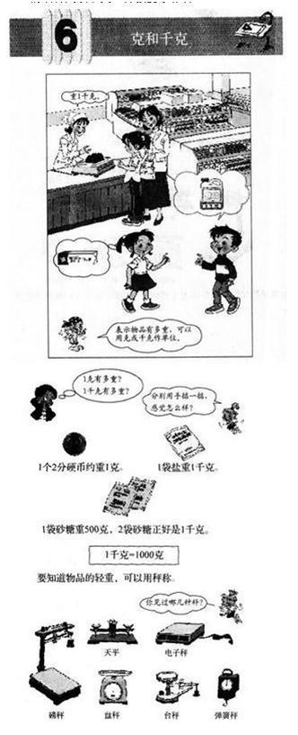 解析 1.1.教学目标 (1)在具体生活情境中,感受并认识质量单位克和千克。 (2)初步建立1克和1千克的观念,知道1千克=1000克。 (3)掌握用秤称量物体的方法。 (4)在建立质量观念的基础上,培养学生估量物体质量的意识。 2.教学重点 初步建立1克和1千克的观念。 2. 一、创设情境,体验轻重 师:小朋友们,你们喜欢逛超市吗?老师也喜欢,昨天我在超市买了两样东西,猜一猜,哪个更重?你怎样知道是它重?(面条和苹果) 学生可能会说用秤称,可能会说掂一掂,还可能说看标签…… 师:看来物品有轻有重,我们把物体的轻重叫作物体的质量。 二、认识秤,揭示课题 1.出示:常见的秤挂图。 师:刚才说可以用秤称,生活中有各种各样的秤,你都认识些什么秤?在哪里见过? 2.介绍一些常见的秤。重点介绍天平和盘秤。 小结:它们都可以用来称物品的质量。 3.揭示课题。 师:表示物品质量的单位有克和千克。这节课我们就要来研究“克和千克”。(板书:克和千克) 三、认识克,感受1克和几克 1.掂一掂1克的物品,感受1克的质量。(1个2分硬币) 师:你想知道1克是多重吗? 学生掂一掂,再闭上眼睛,感受1克的质量,你有什么感受?(很轻) 2.说一说,你觉得哪些物品也是大约1克。(药片、小发卡、纽扣、小螺丝、一粒花生、一个乒乓球、一片树叶……) 3.掂一掂,比一比。分别掂一掂一支铅笔、一袋米、一包盐的重量,比一比谁重,感受几克、100克、500克的重量。一般比较轻的物体我们用克做单位,用字母表示是g。 4.估一估数学课本有多重?再称一称。(1本数学课本大约重150克) 5.介绍天平。称较轻的物品要用到一种秤——天平。 四、认识“千克”,感受1千克和几千克 1.感受1千克。 师:物体有轻有重,称比较轻的物体我们用克做单位,称比较重的物体时我们就周千克做单位。那1千克有多重呢? 1扎面条的重量就是1千克,也可以用1kg表示。 师:请同学们用手掂一掂1扎面条,感受一下1千克有多重。(学生用手掂一掂) 师:你觉得1千克怎么样?(挺重)1千克就是我们平时说的2斤。但斤不是国际通用单位。 2.说一说哪些物品大约重1千克。 3.判断:1千克铁和1千克棉花比较,哪个重一些? 小结:不论物体的颜色、形状、大小如何,1千克重的感觉是一样的。 4.估计几千克,称书包。 师:你估计书包有多重?你是怎样估计的?(引导学生与1千克对比) 师:好,咱们用盘秤来称一称,看你估计得准不准确。(指导学生使用盘秤) (出示盘秤)观察一下盘秤,你们有什么发现?(让学生看到指针和单位千克) 5.当我们用盘秤称东西的时候,当指针指到1就表示1千克。下面,我们就来称1千克的东西吧。(称1千克的东西:1扎面条、1罐奶粉、两袋盐……) 6.称一称:1千克苹果有几个?1千克香蕉有几个? 7.活动:感受几十千克,称体重,互相抱一抱。(体重在20~35千克) 五、认识千克与克的关系 师:一包食盐有500克,两包呢? 生:1000克,因为500克加500克等于1000克。 师:再用盘秤称一称两包盐的重量。指针指向l,两包盐的重量是(1千克)。你发现了什么?(1千克等于1000克) 5千克等于多少克?3000克等于多少千克? 六、拓展深化 1.玲玲是二年级的学生,自从学习了克和千克的认识后,她对周围物体的质量可感兴趣了,下面是她称出的物体的质量,这个马大哈,把什么给漏了,你能帮她补上吗?(课本第89页第4题) 2.认真阅读玲玲的日记,你能发现什么? 我是一名二年级的小朋友,每天早晨,我从1千米高的床上起来,拿起重9千克的牙刷,刷牙洗脸后,吃了一个200千克的面包,一个50千克的鸡蛋,然后背起2克的书包,穿上250千克重的鞋上学去了。 七、全课小结 你有什么收获?