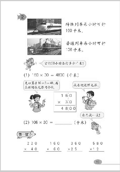 解析 1、模型思想 数学模型是用数学语言概括地或近似地描述现实世界事物的特征,数量关系和空间形式的一种数学结构。数学的模型思想是一般化的思想方法,数学模型的主要模型形式是数学符号表达式和图表,因而它与符号化思想有很多相同之处,同样具有普遍的意义。 本课属于乘积模型。小学数学中的数量关系有两个基本的模型:一个是总体等于部分的和,即求和的模式,部分+部分=和;另一个模型是乘积的模型,总价=单价*数量、路程=速度*时间,这两个常见的数量关系是乘积关系的模型。 2、 教学目标 知识与技能:让学生经历探索三位数乘以两位数笔算方法的过程,掌握三位数乘以两位数的基本笔算方法,能正确进行计算。 过程与方法:让学生在探索计算方法和解决实际问题的过程中体会新旧知识的联系,能主动总结、归纳三位数乘以两位数的笔算方法,培养类比及分析,概括能力,发展应用意识。 情感态度价值现:让学生在主动参与活动的过程中,进一步体验数学在日常生活中的运用,感受估算在生活中的应用。 3、教学环节 (一)复习导入 1.观察下列算式中两个因数有什么特点?(板书:因数末尾有0) 出示:60*50 240*20 师:你是怎么口算的?(学生讨论) 师:(板书口算方法)你能用口算的方法进行笔算吗? 2.这节课继续学习笔算乘法(板书课题:笔算乘法) 【设计意图】复习口算知识,为末尾有0的乘法笔算做好准备;复习笔算知识,为中间有0的笔算除法做好准备,同时熟悉乘法笔算的基本步骤。 (二)巧用知识迁移,自主构建新知 师:你能运用因数末尾有0的笔算乘法解决生活中的问题吗? 出示材料,特快列车每小时可行160千米,普通列车每小时可行106千米。 师:读材料,你能提出什么问题?(学生讨论) 1.出示问题:特快列车每小时行160千米,30小时能行多少千米? 分析数量关系,学生自主列算式。 师:观察这道题,算式的因数有什么特点?(板书因数末尾有0)你想怎么算? 提示学生①3为什么和6对齐?②积末尾的2个0是怎么得来的?③如果末位对齐,个位上的0乘160得几?这一步可以省略不写吗? 2.因数中间有0,计算时应该注意什么?怎样算更加简便。 两个因数末位有0的简便算法是先把0前面的数相乘,再看两个因数末位一共有几个0,则在积的末尾添写上几个0。 (板书:末尾有0不漏算。) 3.出示问题例题 普通列车每小时行106千米,30小时能行多少千米? 分析数量关系,学生自主列算式。 师:观察这道题算式的因数有什么特点?(因数中间有0)应该注意什么? 因数中间有0的乘法,用0乘这一步可以省略,但要注意用因数哪一位上的数乘,乘得的数的末位就要和那一位对齐。 【设计意图】使学生通过对比选择,掌握竖式的简便写法,在自主探索中掌握中间、末尾有0的计算方法。在这个过程中,要注意引导学生在自主探索、合作交流中体验各种算法,选择出最优的方法。 (三)巩固练习 师:下面,老师带同学们到数学王国遨游吧! 1.完成课后练习 2.独立完成,全班讨论 【设计意图】通过多层次的练习,让学生对练习过程中既强化了本节课的学习重点,又训练了学生的思维,打破思维定势,培养学生思维的灵活性。 (四)师生小结,畅谈收获 【设计意图】小结本课重点,加深印象,感受学习知识的过程。