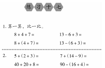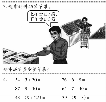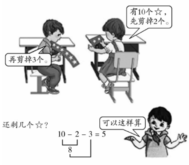 解析 1、根据《义务教育数学课程标准(2011年版)》,本材料的教学应注重学生在知识技能、数学思考、问题解决、情感态度方面的发展。 (1)在知识技能方面,学生通过对本材料的学习,经历从日常生活中抽象出数的过程,掌握必要的运算技能,能准确进行运算。 (2)在数学思考方面,学生通过对本材料的学习,能够运用数及适当的度量单位描述现实生活中的简单现象,发展数感;能对简单数据进行归类,体验数据中蕴涵着的信息;会独立思考问题,表达自己的想法。 (3)在问题解决方面,学生通过对本材料的学习,能够在教师的指导下,从日常生活中发现和提出简单的数学问题,并尝试解决;了解分析问题和解决问题的一些基本方法,知道同一个问题可以有不同的解决方法;体验与他人合作交流解决问题的过程。 (4)在情感态度方面,学生通过对本材料的学习,对身边与数学有关的事物有好奇心,能参与数学活动;在他人帮助下,感受数学活动中的成功,能尝试克服困难;了解数学可以描述生活中的一些现象,感受数学与生活有密切联系。 2、【教学目标】 (1)了解小括号的意义,认识它的作用。 (2)掌握带小括号的算式的运算顺序,会计算带小括号的加减两步算式。 (3)经历“创造”小括号的过程,初步尝试用符号进行数学表达和数学思考的方法。 (4)激发计算兴趣,体会数学符号的简洁性、统一性,具有初步的符号意识。 3、【教学过程】 (1)创设情境,提供研究素材。 小朋友,你们喜欢剪纸吗?小明和小丽想剪出10个五角星,他们正在分配任务呢(出示两位小朋友剪五角星的图片)。 请问,大家从这幅图中能获得哪些信息?你能提出什么数学问题? 预设1:一共剪掉几个星?教师提问:你会列式吗?为什么用加法计算? 预设2:还剩几个星?教师提问:谁能将已知条件和问题连起来完整地说一说?(有10个星,先剪掉了2个,又剪掉了3个。还剩几个星?) (2)尝试探究,确定解题思路。 请学生根据上述数学问题,独立思考,列出算式,再和同桌互相说一说先算什么,再算什么。待学生讨论交流后,组织反馈。 思路一:10-2-3=5(个)。先算减去2个后剩几个,再算又减去3个后还剩几个。 思路二:2+3=5(个),10-5=5(个)。先算一共剪掉几个,再算还剩几个。 对于每个思路,先让学生说清思路,明确算法。然后,教师借助课件帮学生理清思路。最后,学生再次说清思路,教师完善板书,帮学生进一步理清思路。 (3)认知冲突,理解小括号的意义。 如果将分步的两个算式合成一个算式应该怎样列式呢?学生尝试写,教师巡视。 给出错误算式:10-2+3,这样列式可以吗?为什么?看来,要想先算加法,就要在2+3这里添上个符号,说明你要表达的意思。 教师写算式并用彩色笔加上小括号。这个符号叫“小括号”(板书课题:小括号)。教师领读,学生齐读。 小括号就像我们的左手和右手,把2和3这对好朋友围在一起。它起到改变运算顺序的作用。计算时要先算小括号里的2+3=5,再算小括号外面的10-5=5(教师画运算顺序)。 那么,加了小括号的算式怎么读呢?教师指导读法。 做一做,说说下面各题应先算什么,再计算。对于两步算式,大家应当注意什么? 学生回答,教师小结:有小括号的要先算小括号里面的;如果没有小括号,就从左往右按顺序计算。 (4)巩固深化,强化小括号的用法。 我们学习了小括号的用法,那么你敢挑战这些题目吗? 请学生做练习十七第1题,算一算,比一比,更深刻地理解小括号的作用。 请学生以比赛形式做练习十七第2题,看看谁算得又快又准确。 请学生用不同的算法做练习十七第3题,同桌互相检查,保证全班学生都理解了小括号的含义和用途。 思维游乐园:给练习十七第4题的算式填上小括号。教师提醒:按顺序算不容易得出结果,就可以用小括号改变运算顺序,简化算式。 (5)总结提升,拓展小括号的用法。 请学生自主总结小括号的作用、计算方法。教师对学生的总结进行确认、扩充。 总结:今天我们又认识了一位数学王国的新朋友——小括号。它就像左手和右手,让好朋友们围在一起,起到改变运算顺序的作用。计算时,有小括号的要先算小括号里面的;如果没有小括号,就从左往右按顺序计算。 这节课,大家能独立思考、快乐地与他人合作。我相信大家收获的不仅仅是知识,更重要的是收获了认真观察、善于思考的好习惯。希望大家在数学王国里能结识更多的新朋友,让它们都变成我们的好朋友。