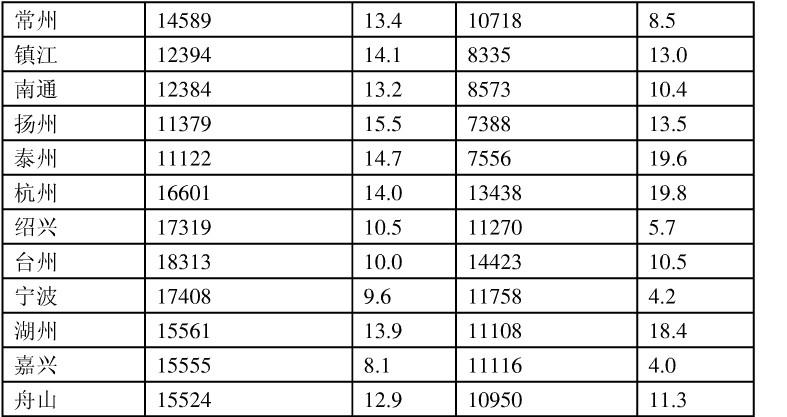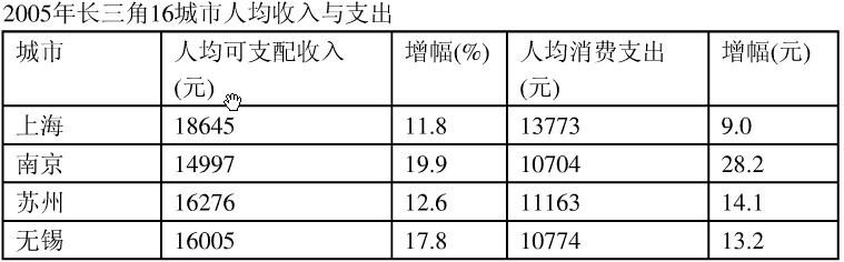 根据下面表格所提供的信息回答问题: 根据上表,可以判断2005年区域城市人均可支配收入最高的是: A. 上海 B. 江苏8市...