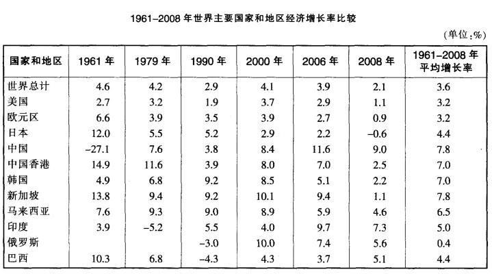 解析 由材料可知,1960年到1982年GDP总量呈稳步小幅上升态势,1982年后逐年稳步大幅增加,故1960-1982年GDP年均增长率小于1960-2008年的年均增长率,应选择A。