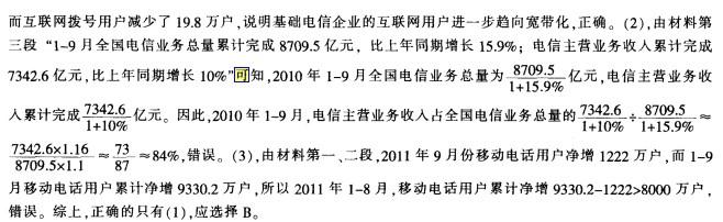 问题 工业和信息化部发布的数据显示,2011年9月份全国电话用户净增1185.6万户,总数达到124073.8万户。其中,固定电话用户减少36.3万户、移动电话用户净增1222万户,创造单月净增用户新纪录。 据统计,2011年1-9月全国固定电话用户减少590.8万户,达到28843.3万户;移动电话 用户累计净增9330.2万户,达到95230.5万户。移动电话用户中,3G用户净增5540.6万户,用户规模首次突破1亿户,达到10245.7万户。此外,1-9月全国基础电信企业互联网宽带接人用 户净增2364.1万户,达到14993.2万户,而互联网拨号用户减少了 19.8万户,达到570.3万户。 在电信业务收入方面,1-9月全国电信业务总量累计完成8709.5亿元,比上年同期增长15.9%;电信主营业务收入累计完成7342.6亿元,比上年同期增长10%。其中,移动通信收入累计完成5296.5亿元,比上年同期增长13.9%,在电信主营业务收入中所占的比重从上年同期的 69.61%上升到72.13%;固定通信收入累计完成2046.2亿元,比上年同期增长0.8%。按区域看,东、中、西部地区电信主营业务收人比上年同期分别增长了 7.8%、9.6%、11.7%。 下列说法中正确的有几个? (1)基础电信企业的互联网用户进一步趋向宽带化 (2)2010年1-9月,电信主营业务收人占全国电信业务总量的80% (3)2011年1-8月,移动电话用户累计净增8000万户 A.0个 B.1个 C.2个 D.3个