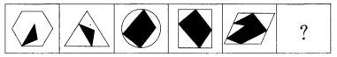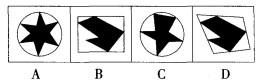 解析 题干图形的共同特征是都有一个阴影。因阴影部分中有不规则图形,无法计算面积。此题考查的是图形内部阴影部分与外部图形的交点个数,依次为1、2、3、4、5、(6),只有A项满足条件。