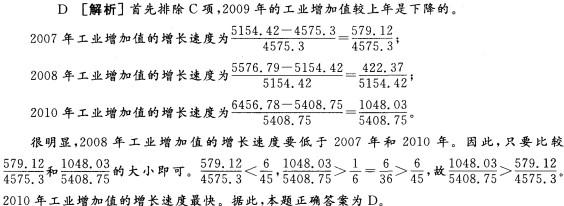 问题 2010年上海全年实现工业增加值6456. 78亿元,比上年增长17.5%。其中,规模以上工业增加值6225. 98亿元,增长18. 4%。在规模以上工业增加值中,轻工业增加值1866. 21亿元,增长15. 9%;重工业增加值4359. 77亿元,增长19. 5%。全年工业总产值31038. 57亿元, 比上年增长22.9%。其中,规模以上工业总产值30003. 57亿元,增长23.1%。“十一五”时期 全市工业总产值达到124305. 48亿元,年均增长12.6%。 2010年全年,上海市电子信息产品制造业、汽车制造业、石油化工及精细化工制造业、精品钢材制造业、成套设备制造业、生物医药制造业等六个重点发展工业行业完成工业总产值 19863. 27亿元,比上年增长26. 6%,占全市规模以上工业总产值的比重达到66. 2%。 2007—2010年上海市工业增加值的增长速度最快的是( )。 A. 2007 年 B. 2008 年 C. 2009 年 D. 2010 年