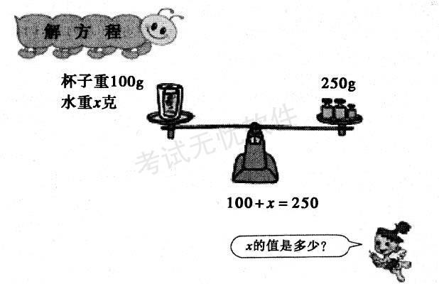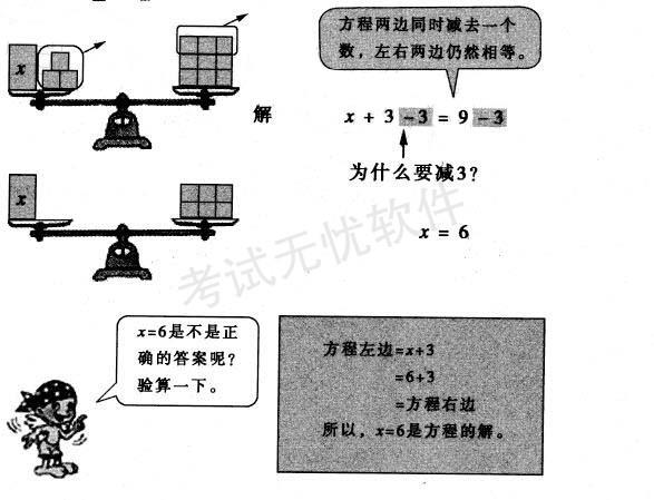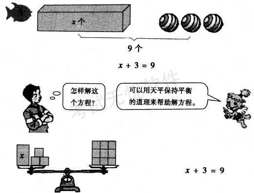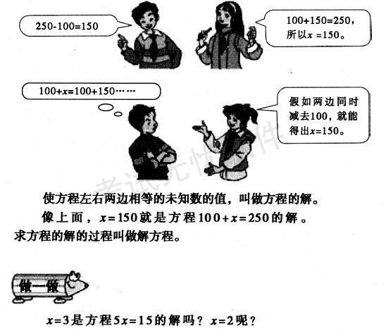 解析 (1) 方程是等式,又含有未数,两者缺一不可。在方程里的未知数可以参加运算,并且只有当未知数为特定的数值时,方程才成立。与方程不同,算术式是一个式子,它由运算符号和已知数组成,它表示未知数。 (2) 教学目标: ① 知识与技能目标 , 根据等式的性质,使学生初步掌握解方程和检验的方法,并理解解方程和方程的解的概念。 ② 过程与方法目标 通过自主讨论的方式,培养学生运用代换思想和分析能力进行解题的方法。 ③ 情感态度与价值观目标 培养学生运用分析能力以及应用所学知识解决实际问题的能力,帮助学生养成自觉检验的良好习惯。 教学重点:理解并掌握解方程的方法。 (3) 新授部分教学环节: ① 看图写方程 教师通过多媒体出示图片,请同学说出从图中得到的数学信息都有哪些?能根据这幅图片列出方程吗?通过同学回答与老师补充给出答案:知道杯子重100克,水重X克,合起来是250克。列出方程来,即是100 + X=250。 ② 分组讨论求方程中的未知数 教师提出问题:那么方程中的X等于多少呢?请同学们同桌两人一组进行讨论,说说你是怎么想的?讨论以后请同学陈述自已的观点。可能有以下的观点: a. 根据加减法之间的关系250—100 = 150,所以X=150。 b. 根据数的组成100+150 = 250,所以X=150。 c. 100+X=250 = 100+150,所以 X=150。 d. 假如在方程左右两边同时减去100,那么也可得出X=150。 教师给予鼓励并引出方程的解和解方程两个概念。 教师:我们说X=150是方程100 + X==250的解,求未知数X的过程叫解方程。 ③ 自读探究方程的解与解方程的概念 同学们自学课本找出什么叫方程的解。什么叫解方程。 请同学回答,教师给予评价鼓励并补充完整:方程的解是未知数的值,它是一个数。判断一个数是不是方程的解的方法是看这个数能不能使方程左右两边相等。而解方程是求未知数的过程,是一个计算过程。它的目的是求出方程的解。 设计理由:在列方程和学生分组讨论的逐步深入地学习过程下,教师引导学生通过自读探究的方法进行概念的学习与辨析,培养学生的分组合作能力以及自主学习和判断的能力。