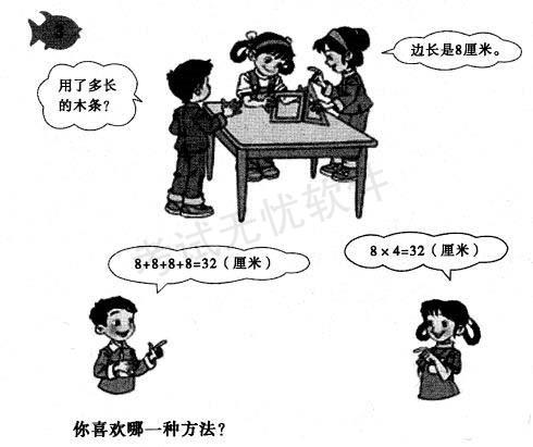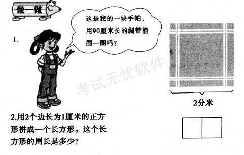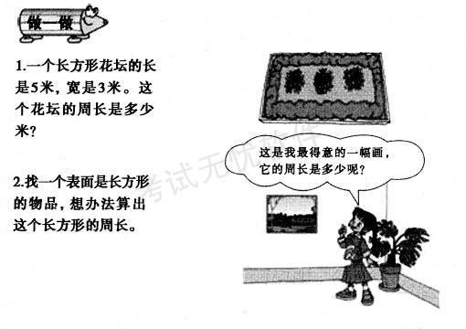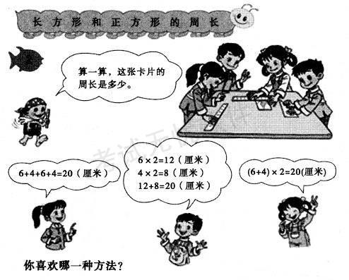 解析 (1)长方形特征:对边相等,4个角都是直角的四边形,有两条对称轴。 周长计算公式:c=2(a+b)。 正方形特征:四条边都相等,四个角都是直角,有4条对称轴。 周长计算公式:c=4a (2)教学目标: ① 知识与技能目标 探索长方形和正方形的周长的计算过程,掌握长方形和正方形周长的计算方法。 ② 过程与方法目标 通过观察、测量和计算等活动,在获得直观经验的同时发展空间观念。 ③ 情感态度与价值观目标 在学习活动中体会现实生活里的数学,激发对数学的兴趣。培养交往、合作和探究的意识与能力。 教学重点:探索并掌握长方形周长的计算方法。 (3)课堂导入环节: 复习周长的定义,周长是有长短的。那么你能判断下面的长方形和正方形的周长,哪一个长一些?有的同学说长方形的周长长一些,有的说正方形的周长长一些,有的说两个图形的周长一样长。 设计理由:通过复习旧的知识为将要学习的知识做准备。 教师:现在有三种不同意见,谁能想出一个比较好的办法,证明你的判断是正确的,让大家心服口服,可以独立思考,也可以同桌讨论。请同学说出自己的看法,教师给予鼓励并补充。 ① 用一根细线来“围”住图形,然后再量一下绳子的长就可以了。 ② 我想把这两个图形都围绕一个尺子滚动一周,就能知道谁的周长大一些了。 ③ 我想先量出每条边的长度,再把几条边的长度加起来就可以比较了。 教师:大家想到的方法,都可以求出这两个图形的周长,也能比较出它们的长短。如果我们要大家比较的不是两个图形,而是两个不同操场的周长,那么用哪一种方法比较方便又比较准确呢?引导学生回答用“滚”的方法是不行的,“围”的方法太麻烦了,用“先量再算”的方法比较方便准确。今天,我们就一起来研究长方形和正方形周长的计算方法。 设计理由:通过动手操作的方式激发学生的学习兴趣,培养学生的创新思维。