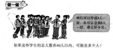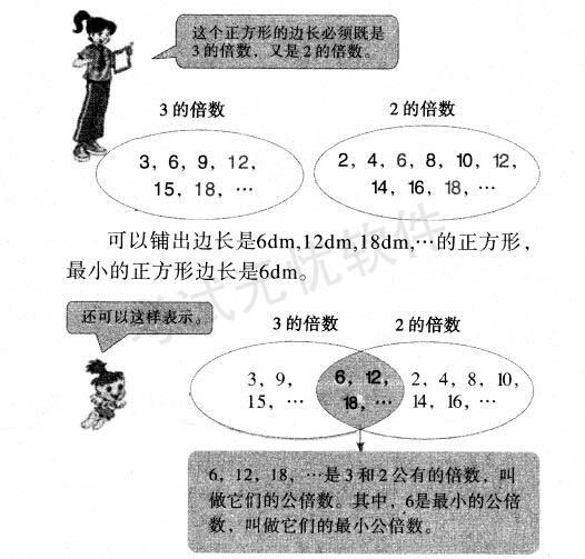 解析 (1) 课题中体现的是数形结合思想。数和形是数学研究的两个主要对象,数离不开形,形离不开数,一方面抽象的数学概念,复杂的数量关系,借助图形使之直观化、形象化、简单化。另一方面复杂的形体可以用简单的数量关系表示。在解应用题中常常借助线段图的直观帮助分析数量关系。 (2) 教学目标: ① 知识与技能目标:理解两个数的公倍数和最小公倍数的意义。 ② 过程与方法目标:通过解决实际问题,初步了解两个数的公倍数和最小公倍数在现实生活中的应用。 ③ 情感态度与价值观目标:培养学生抽象、概括的能力,激发学生学习数学的兴趣。 本课的教学重点为:理解两个数的公倍数和最小公倍数的意义。 (3) 新授环节设计: ?设置任务,引入公倍数 拿出老师课前发的画有两条直线的纸。在第一条直线上找出4的倍数所在的点,画上黑点。在第二条直线上找出6的倍数所在的点,圈上小圆圈。 请学生出示结果,并给以鼓励。通过多媒体课件展示两条数轴,并根据学生报的数,仿效出现黑点和小圆圈。 教师:观察从4和6的倍数中你发现了什么? 学生回答后,多媒体课件演示两条数轴合并在一起,闪现12和24。我们发现有些数既是4的倍数,又是6的倍数,如果让你给这些数起个名,把它们叫做4和6的什么数呢?板书:公倍数。大家说说看,什么叫两个数的公倍数? ?分组讨论集合图表示公倍数 如果让你把4的倍数、6的倍数、4和6的公倍数填在下面的图中,你会填吗?试试看。 同桌两人可以讨论一下。请学生展示自己的做法,教师给予鼓励并补充。 ?引入最小公倍数 继续集合的表示,提问为什么三个部分里都要添上省略号? 4和6的公倍数还有哪些?有没有最大公倍数?有没有最小公倍数? 请同学思考并作答,教师给予补充:两个数的公倍数很多,没有最大公倍数,只有最小公倍数,4和6的最小公倍数是12。 设计理由:让学生亲自动手操作,自主探究学习,教师在教学过程中作为一个引导者,培养学生的自主学习的能力。同时,分组讨论,培养了学生的交流合作能力。