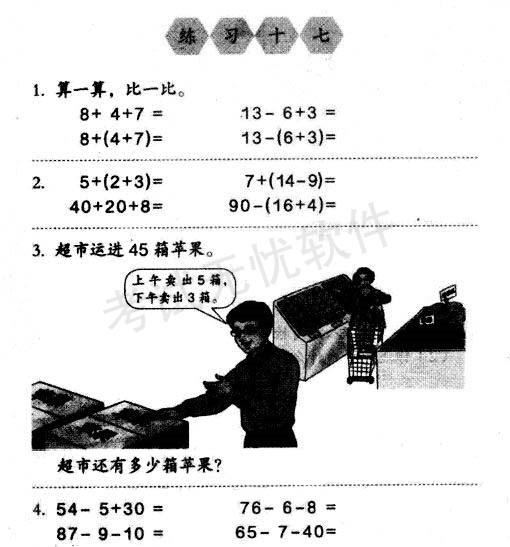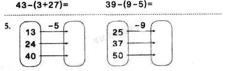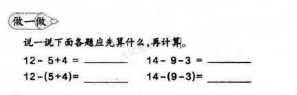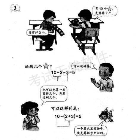 解析 [参考答案](1)《义务教育数学课程标准(2011年版)》说明,在数学课程中,应注重培养学生的数感、符号意识、空间观念、运算能力等,本材料选自《两位数减一位数、整十数》,要求学生初步了解小括号,及带小括号的加、减两步式题的运算顺序,因此本课要重视学生符号 意识的应用和运算能力的发展。 (2) 根据小学数学新课标的理念和低年级学生的特点,拟定三维教学目标如下: 知识与技能目标:认识小括号,初步了解带小括号的加、减两步式题的运算顺序,能够正确计算带小括号的加、减两步式题。 过程与方法目标:通过学生自主探索、解决问题的过程,培养学生对数学信息的处理能力和问题解决能力,发展学生的教学符号感。 情感态度与价值观目标:培养学生对数学学科的兴趣,引导学生领会数学应用的意识,体会数学价值。 (3) 教学过程 一、 通过游戏,复习导入 请同学们通过竞赛抢答的方式快速说说14 -8 -3、8 + 6 -7、15 -7 + 5的答案及计算顺序,引导学生回忆加、减两步式题的运算顺序是从左到右依次计算。同时请同学们想想能不能换一种顺序来解答,导入新课。 二、 探究新知 1. 出示教材内容请同学们‘出圆片,代表五角星,在桌上摆一摆。 引导学生想一想:怎样算出还剩几个呢?如何列算式呢?鼓励学生相互之间进行讨论。 2. 引导学生说出不同的解题思路: ① 从10个里面去掉2个,再去掉3个,剩下5个。 ② 把2个和3个合起来一共是5个,再从10个里面一起去掉5个,还剩5个。 ③ 怎样列算式呢?板书:“10 -2 -3 = ",“10 -(2 + 3) = ” 第一种算法:先算10减2,再减3。 第二种算法:计算中要先计算2+3,但这一步在后面,这就需要改变运算顺序,因此要在先计算的这一步加上一个小括号。板书课题:“小括号” 师生共同根据小括号的作用,列出两种算法的算式。 10 -2 -3= ? 10 -(2 + 3) = ? ④引导学生计算。 10 -2 -3 = ?先算 10 -2 = 8,再 000000000 算 8 - 3 = 5。(板书结果) 10 -(2 + 3) = ?先算 2 + 3 = 5,再算 10 -5=5。(板书结果) 三、 课堂学习 引导学生自己独立完成练习十七的算一算,比一比,同学之间进行交流,并讨论发现了什么。 四、 全课小结 教师引导学生总结:我们学习了带小括号的加减两步式题的计算方法:“在一个算式里有 括号的,先算括号里面的。”(板书) 教师引导学生补充:这个括号与前面的填括号的题不同,如5 + ( ) = 11是要在括号里填 一个数6,而10 -(2 + 3)括号里给出了数和加号,是要先算2 + 3 = 5。 五、 布置作业 请同学们课后思考:你喜欢小括号吗?为什么?(也可以不布置作业)