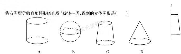 解析 直角梯形绕对称轴I旋转后上底形成的圆小于下底形成的圆,因此得到的立体图形应该是一个圆台。