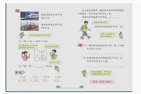 解析 (1)模型思想 定义:数学模型是用数学语言概括地或近似地描述现实世界事物地特征,数量关系和空间形式的一种数学结构。 分类:小学数学中的数量关系有两个基本的模型:一个是总体等于部分的和,即求和的模式,部分十部分=和;另一个模型是乘积的模型,总价=单价数量、路程=速度时间,这两个常见的数量关系是乘积关系的模型。 (2)知识与技能:初步掌握三位数乘两位数的笔算方法,并能正确地进行运算。 过程与方法:学生能根据两位数乘两位数的笔算方法,类推并掌握三位数乘两位数的笔算方法,初步培养迁移能力。 情感态度价值观:体验数学在日常生活中的运用。 培养估算的习惯 (3) 一、情景导入 (一)出示例题情景: 图片:特快列车每小时可行160千米;普通列车每小时可行106千米 问题:它们30小时各行多少千米? 学生根据题意,独立写出解题算式。 设计理由:创设了一个生活中学生比较熟悉的情景,希望学生能主动投入到估算中来,激发学生的学习兴趣,并且联系学生的已有知识。用已有知识来解决新问题是数学学习的重要方法。 二、质疑与探索 (一)重点围绕竖式的简便写法和积进行讨论 1.写竖式时,如何处理“0”和“非0”数字的对位问题 2.怎样确定积的末尾零的个数 3.如果通过竖式的计算来推导出路程,速度,时间的关系。 (二)反馈第(1)题:请不同算法的学生说一说…… (三)反馈第(2)题:重点围绕竖式的简便写法 1.因数末尾有0如何列竖式简便?应注意什么? 答案:“先把0前面的数相乘,再看两个因数末尾一共有几个0,则在积的末尾添写几个0。” 2.因数中间有0,计算时应注意什么? 答案:乘数中间有0的乘法,用0乘这一步可以省略。但要注意用乘数哪一位上的数乘,乘得的数的末位就要和那一位对齐。 (四)反馈第(3)(4)(5)题:学生分小组讨论,速度的描述方法?速度、时间和路程的关系? 答案:得出等式——速度乘以时间=路程。 设计理由:让学生通过对不同方法的比较、算法之间内在联系的深入分析,从中逐步体验到竖式计算简洁、明白、通用、易查的优越性,体验到竖式计算的优越性和学习竖式的价值。在这个过程中,注重引导学生在自主探索、合作交流中体验各种算法。感悟和选择出最优的方法。 三、巩固练习: (一)尝试完成课后练习 (二)学生独立完成,全班讨论订正 (设计理由:通过练习和方法比较让学生进一步掌握因数有0的三位数乘两位数的算法。) 四、全课小结和课后作业 (一)让学生总结这节课我们学习了什么?我们是怎样学会这些新知识的? (二)同学们喜欢看课外书吗?前几天老师买了一套少儿百科全书,付了128元,如果买2套付多少钱呢?5套呢?学校图书室要买12套,你能算出要付多少钱吗? (设计理由:通过总结归纳让学生感受知识的学习过程,通过延伸题目引导学生思考,为下一课时打好基础。)