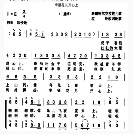 解析 (1)《幸福花儿开心上》是一首柯尔克孜民歌,歌曲情绪热烈、欢快,表现了柯尔克孜族人民在党的领导关怀下的幸福生活。全曲为降E大调,共五个乐句,第五乐句为结束句。优美的旋律使人情不自禁地翩翩起舞。 (2)教学目标 知识与技能目标:能准确掌握歌曲的旋律、节奏,唱好二部合唱;了解柯尔克孜族的民俗及音乐特点。 过程与方法目标:采用视听结合方法来了解柯尔克孜族,并用听唱、模唱等方式学唱歌曲。 情感态度与价值观目标:感受柯尔克孜族民歌《幸福花儿开心上》热烈、欢快的情绪,并准确表现出来,激发对民族音乐的热爱。 (3)导入环节 播放法国号伴奏音乐,学生跟着老师走三步进教室。 播放柯尔克孜族民歌的一段音乐画面,与学生一起来欣赏,提出三个问题。 师:你们知道这是哪个少数民族的音乐吗?你们了解这个民族吗?这个民族有什么特点? 学生根据自己所了解的来回答问题。 设计意图:柯尔克孜族是学生比较陌生的一个民族,直接用影像的形式展示给学生,让学生很直观地感受这个民族的音乐风格和特点,让学生在欢快、美妙的音乐声中,投入到音乐课堂,且在很短的时间内产生兴趣。老师跟学生分享搜集的资料,让学生在欣赏了影像后用文字的形式直接展示给他们,让他们对这个陌生的民族变得更加了解和熟悉,为后面歌曲的学习作铺垫。