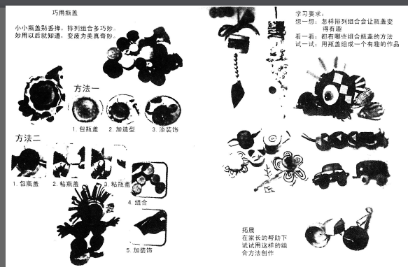解析 (1)一个基本图形,经过排列组合,通过重复,组成各种有趣的图形,能够发挥学生的想象能力,激发创新意识。 (2)教学目标 知识与技能目标:了解瓶盖的造型特点,学会用瓶盖排列、拼贴图形。 过程与方法目标:能够利用废弃的瓶盖进行创作,将各种瓶盖组合起来制作有趣的物品。 情感态度与价值观目标:在实践的过程中,体验制作的乐趣,提高想象力和创造力,增强勤俭节约的环保意识。 (3)教学过程 (一)朗诵歌谣,新课导入 师:小小瓶盖别丢掉,排列组合多巧妙。妙用以后就知道,变废为美真奇妙一瓶盖是我们日常生活中随处可见的,其实我们把它巧妙地组合起来,就会达到意想不到的效果,现在想一想平时我们用过之后都会把它们随手丢掉,是不是很可惜呢。今天我们将这些被我们忽略的瓶盖利用起来。(引出课题巧用瓶盖) (设计意图:通过朗诵歌谣的形式,提高学生对废旧材料制作的兴趣和环保意识。) (二)交流讨论,新课教学 师:现在大家将自己上课之前收集起来的瓶盖摆在桌上,请同学来说一下你找到的瓶盖与其他同学的有什么不同的地方。(瓶盖的颜色、纹理、材质等) 学生思考并回答,教师总结,虽然大家收集的瓶盖是各种各样的,但是我们发现瓶盖都是圆形的。 师:在我们的生活中大家还能说出哪些圆形的事物呢?(太阳、花朵、小动物的头、电风扇、花盆等)。 继续提问,引导学生思考问题,这些圆形的物体或物体的部分和我们带来的瓶盖有什么关系? 学生回答,可以用瓶盖将它们做出来。 师:现在我们就用我们手中的瓶盖来试一下,摆一摆,看看大家能有什么样的发现,说一说都有一哪些方法? 学生回答,教师总结,可以用排列、拼贴的方法来进行制作。 (设计意图:通过对瓶盖的比较、联想,使学生了解瓶盖的造型特点,同时学生的兴趣被调动起来,加深了制作的愿望。) (三)教师示范,加深理解 教师示范小乌龟、小蜗牛的制作方法,学生参与其中。 方法一:包瓶盖、加造型、添装饰 方法二:包瓶盖、粘瓶盖、组合、加装饰 (设计意图:重点示范,并让学生参与其中,让学生更直观地了解利用瓶盖的特点进行制作的方法。) (四)实践练习,体会制作方法 1.任选题材,综合运用材料创作瓶盖作品,创作时可以选择自己喜欢的创作形式。 2.学生练习,教师巡回指导。 (设计意图:创作时,学生综合运用不同的材料表达自己的想法,充分发挥了自己的聪明才智,体验成功的快乐,探索创造的灵感) (五)展示评价,作业小结 1.学生自愿分享作品,并从创意、创作方法等几个方面进行自评、互评、教师点评。 2.以提问的形式回顾本节课的知识。 3.布置课后作业:观察生活中的事物,在父母的帮助下试一试家中其他的废旧物品还可以制作成什么艺术作品。 (设计意图:教学展示评价环节中,学生通过欣赏别人的作品,从中体会不同的创意。课后让学生与父母运用其他废旧物品进行创作,这样可增强学生的想象力和创造力,增强他们勤俭节约的环保意识。)