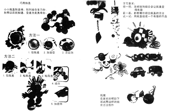 解析 (1)一个基本图形,经过排列组合,通过重复,组成各种有趣的图形,能够发挥学生的想象能力,激发创新意识。 (2)教学目标 知识与技能目标:了解瓶盖的造型特点,学会用瓶盖排列、拼贴图形。 过程与方法目标:能够利用废弃的瓶盖进行创作,将各种瓶盖组合起来制作有趣的物品。 情感态度与价值观目标:在实践的过程中,体验制作的乐趣,提高想象力和创造力,增强勤俭节约的环保意识。 (3)教学过程 (一)朗诵歌谣,新课导入 师:小小瓶盖别丢掉,排列组合多巧妙。妙用以后就知道,变废为美真奇妙一瓶盖是我们日常生活中随处可见的,其实我们把它巧妙地组合起来,就会达到意想不到的效果,现在想一想平时我们用过之后都会把它们随手丢掉,是不是很可惜呢。今天我们将这些被我们忽略的瓶盖利用起来。(引出课题巧用瓶盖) (设计意图:通过朗诵歌谣的形式,提高学生对废旧材料制作的兴趣和环保意识。) (二)交流讨论,新课教学 师:现在大家将自己上课之前收集起来的瓶盖摆在桌上,请同学来说一下你找到的瓶盖与其他同学的有什么不同的地方。(瓶盖的颜色、纹理、材质等) 学生思考并回答,教师总结,虽然大家收集的瓶盖是各种各样的,但是我们发现瓶盖都是圆形的。 师:在我们的生活中大家还能说出哪些圆形的事物呢?(太阳、花朵、小动物的头、电风扇、花盆等)。 继续提问,引导学生思考问题,这些圆形的物体或物体的部分和我们带来的瓶盖有什么关系? 学生回答,可以用瓶盖将它们做出来。 师:现在我们就用我们手中的瓶盖来试一下,摆一摆,看看大家能有什么样的发现,说一说都有一哪些方法? 学生回答,教师总结,可以用排列、拼贴的方法来进行制作。 (设计意图:通过对瓶盖的比较、联想,使学生了解瓶盖的造型特点,同时学生的兴趣被调动起来,加深了制作的愿望。) (三)教师示范,加深理解 教师示范小乌龟、小蜗牛的制作方法,学生参与其中。 方法一:包瓶盖、加造型、添装饰 方法二:包瓶盖、粘瓶盖、组合、加装饰 (设计意图:重点示范,并让学生参与其中,让学生更直观地了解利用瓶盖的特点进行制作的方法。) (四)实践练习,体会制作方法 1.任选题材,综合运用材料创作瓶盖作品,创作时可以选择自己喜欢的创作形式。 2.学生练习,教师巡回指导。 (设计意图:创作时,学生综合运用不同的材料表达自己的想法,充分发挥了自己的聪明才智,体验成功的快乐,探索创造的灵感) (五)展示评价,作业小结 1.学生自愿分享作品,并从创意、创作方法等几个方面进行自评、互评、教师点评。 2.以提问的形式回顾本节课的知识。 3.布置课后作业:观察生活中的事物,在父母的帮助下试一试家中其他的废旧物品还可以制作成什么艺术作品。 (设计意图:教学展示评价环节中,学生通过欣赏别人的作品,从中体会不同的创意。课后让学生与父母运用其他废旧物品进行创作,这样可增强学生的想象力和创造力,增强他们勤俭节约的环保意识。)