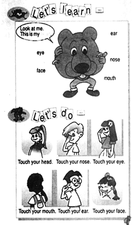 解析 (1)①英语游戏教学符合小学生的心理特点,寓教于乐,可以激发和培养学生学习英语的兴趣。 ②英语游戏教学有利于充分调动学生学习的积极性与主动性,激发学生的思维和创造力,提高学生的语言运用能力。 ③英语游戏教学有利于活跃课堂气氛,让学生在轻松愉快的环境中学习外语,提高课堂教学效果。 ④英语游戏教学将枯燥的语言现象转变为学生乐于接受的游戏形式,化难为易,从而减轻学生的负担,符合素质教育的要求。 ⑤英语游戏教学有利于增长学生的知识,发展学生的智力,培养学生的合作与竞争意识。 (2)知识与技能目标:学生能听懂、会说新单词head,ear,eye,nose,face,mouth;能听懂、会说指令“Touch your…” 过程与方法目标:学生在学与做的过程中,能够借助图片、肢体语言轻松理解语义和进行信息交换。 情感态度与价值观目标:学生能在学习五官单词的过程中,体验英语学习的快乐,提高学习英语的兴趣;通过小组竞赛的活动,学生可以提高自己的合作与竞争意识。 (3)导入环节: 拼图游戏: 教师把全班同学分成六个小组,给每个小组提供四种不同动物(熊、大象、小猫、小狗)的头像(头像缺少五官),让学生把不同动物的五官贴在正确的位置上,看看哪个小组完成得最快。 (设计理由:通过“五官拼图游戏”导入,有利于提高学生对本节课的兴趣,调动学生参与课堂的积极性,自然而然地导入对五官单词的学习。通过小组竞赛的形式进行游戏活动,也可以培养学生的合作与竞争意识。) 操练环节: ①Simon Says 教师发出指令,学生根据指令做出相应动作。做错动作的学生将被淘汰,最后一个人为获胜者。 例如: T:“Simon says touch your nose.” (设计理由:在练习所学单词的同时,锻炼学生们的动手协调、反应能力。) ②Relay Race 教师把学生分成两组,让大家排队站好,队首的同学发号指令,说“Touch your…”,第二个同学正确做完动作后,同样对第三个同学发出指令“Touch your…”。此时原来队首的同学跑到队尾,按照这种方式依次进行。最后,原来在队首的同学再次到达队首时就算完成任务,哪组最快又最准确地完成就算胜利。 (设计理由:以小组合作的方式进行“接力赛”游戏活动,让学生开口说所学的句型和单词,动手做相应动作,锻炼学生的听、说与做的能力,培养学生的合作与竞争意识。)