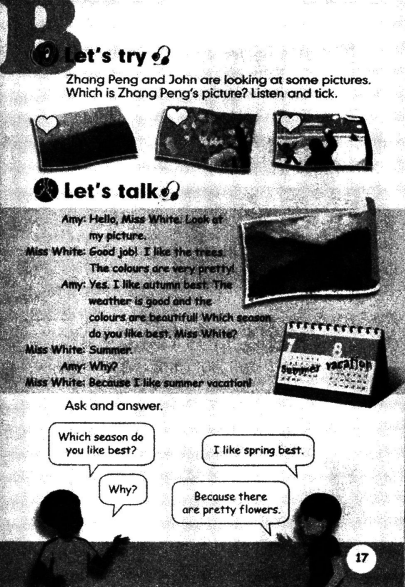 解析 (1)帮助学生提高英语听力水平的方法 ①坚持用英语组织教学,培养学生对英语的语感。 ②注意听力内容的趣味性,让学生在轻松的环境中感受英语。 ③提供真实、多样的语言材料,让学生通过地道、经典的听力材料,熟悉英语的语音、语调和语流。 ④加强听力技能指导,充分利用教材提供的对话、独自、故事等材料,开展模仿录音、理解内容、信息转换、角色扮演等,以实现不同目标。 (2) Teaching Aims Knowledge aims: Students can read and learn the phrase "good job" and"summer vocation" and grasp the sentence "Which season do you like best WhyBecause I like summer vacation". Ability aims: Through activities and group works, students can improve their ability of listening and speaking. Emotional aims: Students can get more interest in nature. (3) 导入环节: Lead-in Greet with the students, and then separate them into four groups: Group Spring, Group Summer, Group Autumn and Group Winter. The first group makes a sentence and other three groups need to use different words to make new sentences, especially using the different adjective words. First begin with the Group Spring. Spring: Spring is green. Summer: Summer is blue. Autumn: Autumn is golden. Winter: Winter is white. T: Ok, very good, now round two. Summer: Summer is hot. Autumn: Autumn is cool. Winter: Winter is cold. Spring: Spring is warm. 【设计意图】 以季节命名各个组,可以激发学生的学习兴趣。小组活动可以更好地帮助学生了解本课内容,并能明确话题。 巩固操练环节:Consolidation ① Write the seasons and reasons on the blackboard, and then ask some students to do the dialogue. S1: Which season do you like best S2: I like best. S1: Why S2: Because T: Now, let's add the winter's reason. Why do you like winter S: Because I like snow and snowman. T: OK, why do you like spring S: Because I like green, and it means young. T: OK, now, I will give you some time to practice the dialogue with your partner, and then I will find some of you to show us your dialogue. ② Prepare four kinds of cards including" color, song, book, singer" and then ask the four groups to choose a kind of cards, and make sentences according to them. T: OK, Group Spring got the singer card. You two, please! S1: Which singer do you like best S2: I like Wang Junkai best. Because he is handsome. 【设计意图】 利用对话可以更好地帮助学生巩固新句型。另外,利用不同种类的卡片来练习句型,可以拓展学生的知识面。
