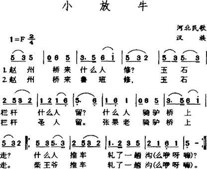 解析 (1)《小放牛》,F大调,2/4拍,是一首欢快、活泼的民间乐曲;作品以唢呐进行演奏,节奏轻快,旋律流畅,生动形象地表现出村姑与牧童的对答情境,为我们展现了一幅美好的画面,表达了孩子们纯真的感情和充满快乐、自豪的心情。 (2)教学目标 情感态度价值观目标:欣赏河北民歌《小放牛》,感受民间乐曲风趣、流畅质朴、活泼欢快的情趣以及牧童快乐的生活,树立积极向上的生活态度。 过程与方法目标:通过欣赏、聆听乐曲《小放牛》,能听辨出音乐中塑造的村姑与牧童对答的形象,对唢呐表现的人物形象有探究的欲望和兴趣。 知识与技能目标:能够哼唱乐曲主旋律,并说出唢呐的特点,记住唢呐的音色。 (3)导入环节 ①教师播放赵州桥的图片,并提问学生:同学们,你们见过这座桥吗(出示图片)谁来描述一下这座桥的样子 ②学生自由回答。 ③教师总结:没有桥墩,只有一个拱形的大桥洞,在大桥洞的顶上左右两边还各有两个拱形的小桥洞。这座桥叫“赵州桥”,位于河北省赵县的洨河上。它是由隋朝的匠师李春设计和参加建造的.到现在已经有1400多年的历史了。 历来有很多歌曲歌唱着这些有名的名胜古迹,今天我们采学习一首乐曲《小放牛》,听听这首作品又是通过什么方式来表现着赵州桥的故事。 【设计意图】 教师通过播放赵州桥的图片以及讲解赵州桥建造的故事来导入新课,激发了学生的学习兴趣.之后启发学生进行思考与分析,使学生更快地将注意力转回到课堂当 中,不仅能够提升学生对课程的好奇心和求知欲,吸引学生的注意力,而且有益于学生了解课程学习的背景,从而与新课更好地连接起来。
