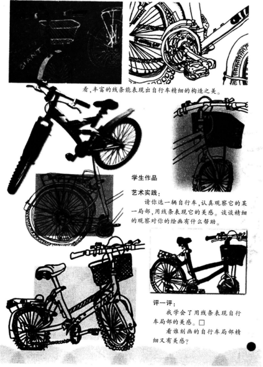 解析 (1)速写是一种快速的写生方法,是以线为主的表现形式。速写同素描一样,既是造型艺术的基础,也是一种独立的艺术形式。 速写练习不仅可以锻炼学生的观察能力,而且能培养其绘画概括能力,加深其记忆力和提高默写能力。通过速写练习,学生还可以收集大量的素材,不断地积累速写经验。同时,也培养了学生的创作能力。速写是由造型训练走向造型创作的必然途径。 (2)教学目标 知识与技能目标:通过本课学习,了解自行车的基本结构,掌握以线为主的造型方法;以速写的形式,对自行车的局部进行写生。 过程与方法目标:通过认真观察,教师讲解、分析并示范,锻炼对自行车局部的观察和造型能力以及对生活中物象的观察与表现能力。 情感态度与价值观目标:养成热爱生活、观察生活、从生活中发现美的良好习惯,感受创作的乐趣,体会和发现生活中的美。 (3)教学环节 环节一:提设问题。导入新课 上课开始,教师提问:大家都会骑自行车吗谁能说出自行车上有哪些构造部件 学生踊跃回答,教师就势导入本课《自行车局部写生》。 【设计意图】 运用提问法导入,激发学生的学习兴趣。从学生生活切入,提高学生的学习热情。 环节二:讲授新知,演示新技能 教师出示自行车ppt,提问:大家认真观察自行车上的细节,看看各部位有什么不同 学生讨论并回答,教师总结:自行车上的不同部位(车座,车把,车轮,脚蹬,链条等)体现了不同的线条,如车身是直线,车轮是弧线,链条和轮胎花纹是曲线、折线等。 教师讲解,要根据实际观察,体会不同的线条给我们的不同感受。教师示范自行车的局部写生,学生观摩学习如何使用线条来表现自行车的各个部位。 【设计意图】 通过提问,使学生了解自行车的基本结构;通过教师示范,学生可以更加深刻地体会不同线条的表现力,并直观感受、学习如何进行速写写生。 环节三:巩固新知,实践练习 教师示范结束,让大家选择自己想要描绘的自行车局部,运用不同的线来进行实践练习,教师巡回指导。 【设计意图】 通过课堂练习,及时掌握速写写生方法,巩固所学新知。 环节四:展示评价,拓展提高把大家的练习作品进行展示,通过学生自评、他评、互评、师评等方式,进行多角度评价。肯定学生学习成果,指出不足,鼓励学生。 【设计意图】 对学生的实践成果进行多主体、全方位的评价交流.不仅体现了学生的主体地位,也体现了教师的主导作用。