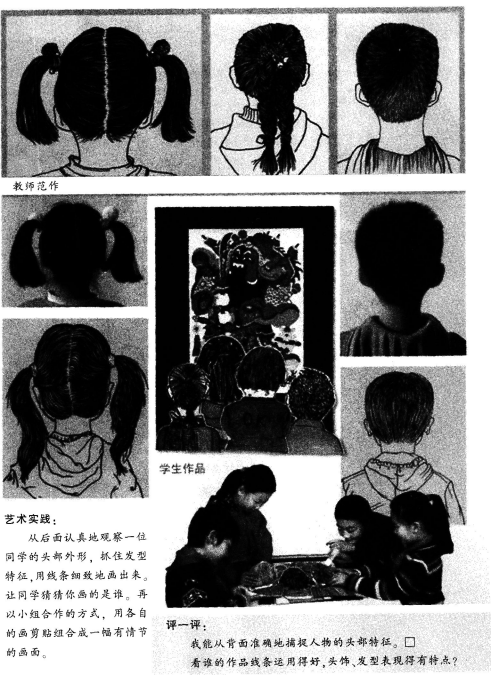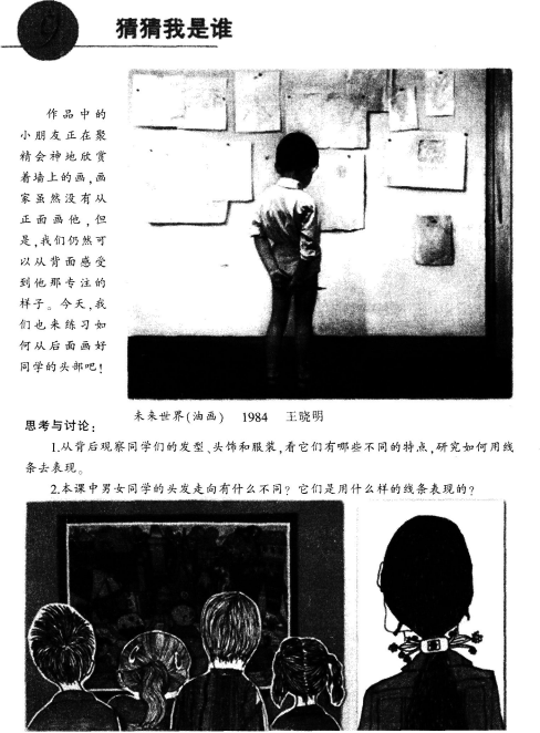 解析 (1)线条是绘画艺术中最基础也是最重要的一部分,可以分为直线和曲线两大类。线条在绘画中不但可以用来勾画外形,而且可以用来表达不同的质感和情感。如它有长短、粗细、曲直、轻重、浓淡、虚实等变化。线条的表现形式不同,给人的情绪的感觉也不同。水平线给人以沉稳的感觉,垂直线让人感到昂奋,曲线给人轻柔委婉的感觉,斜线让人有进取搏击的信心,圆线有永恒团圆的感觉。 (2)教学目标 知识与技能目标:了解人物头部背影写生的步骤,掌握人物造型的绘画方法。 过程与方法目标:通过观察、欣赏的方式,创作一幅同学背影的作品,培养观察能力。 情感态度与价值观目标:养成善于观察、敏于思考的能力。 教学重难点: 教学重点:观察人物特征,掌握人物造型的方法。 教学难点:准确把握人物的特征,恰当地用绘画语言表现出来。 (3)教学过程 活动一:设置游戏.导入新课 教师组织学生开展猜谜游戏,课件展示同学背影图片,提出问题:你们猜猜画面中的是哪一位同学 揭示课题:猜猜我是谁。 【设计意图】 激发学生学习兴趣,将学生的注意力集中在教学的内容上。 活动二:讲授新知.引导想象 ①千姿百态的人物背影 提问:你是如何辨认出自己的同学的呢 学生思考并回答。 教师总结:抓住人物特征。 ②感受人物创作魅力 出示作品《克里斯蒂娜的世界》。 思考:作品给你的感受是什么 学生思考并回答。 教师总结:忧郁感、悲凉的气氛。 提问:作者是怎样表现出这样的情感呢 学生积极思考。 教师总结:抓住人物瞬间动态与周围环境,制造情感意境。 继续欣赏其他作品——《未来世界》,提问:描述你看到的内容,并用语言加以说明。 学生积极思考并回答。 教师总结:作品中的小朋友正在聚精会神地欣赏着墙上的画,画家虽然没有从正面画他,但是.我们仍然可以从背面感受到他专注的神情。 ⑥观察分析创作 通过观察不同发型、不同比例的人物头部背影,提出问题:画中是如何用线条去表现的 学生交流并回答。 教师总结:男生:短而密的线。女生:线到扎头绳的地方集中,然后又分开;用一组一组的长线。 活动三:指导实践.展开实操 学生分组讨论,观察并交流同学头部背影特征,并派小组代表回答。 以班上的同学为对象进行线描写生,画画你观察的同学。 教师示范、学生创作,教师巡视指导并纠错。 【设计意图】 把实际操作环节作为教学重点,旨在培养学生的动手实践能力及造型表现能力。 活动四:展示评价.拓展提高学生到讲台展示自己作品,描述绘画内容;学生相互评价对方作业,教师本着促进学生发展的目的,总结评价。 总结升华:养成热爱写生、热爱创作的美好情感。 【设计意图】 针对学生的实践活动成果进行多主体、全方位的评价交流,不仅体现了学生的主体地位,同时也体现了教师主导的作用。