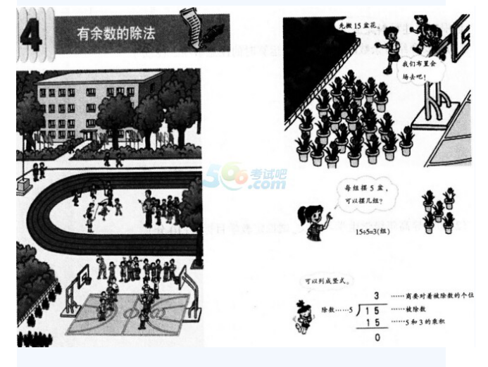 解析 (1)含义:在平均分时,如果分到一定程度,剩下的已经不够再分为一份时,就可以用有余数的除法来表示。注意事项:计算有余数的除法时,余数一定要比除数小。 (2)教学目标 ①知识与技能目标:初步理解有余数的除法的含义,认识余数,探索并发现余数和除数的关系,理解余数要比除数小的道理。 ②过程与方法目标:在获取知识的过程中,渗透借助直观研究问题的意识和方法,积累观察、操作、讨论、合作交流、抽象和概括等数学活动经验,发展抽象思维。 ③情感态度与价值观目标:在自主探究解决问题的过程中,感受数学与生活的联系,体验成功的喜悦。 (3)教学过程设计: 一、创设情境,初步感知 1.出示教材主题图。 2.引导观察.交流信息。 3.教师小结,揭示课题,“有余数的除法”。 二、动手操作,探究意义 (一)复习除法的意义 1.课件出示6个草莓图:把草莓每2个摆一盘.摆一摆。 2.学生交流获取信息。 3.利用学具实际操作。 4.用算式表示操作的过程。 5.小组内说说6÷2=3(盘).这个算式表示的意思。 (二)理解有余数除法的含义 1.在动手操作中感受平均分时会出现有剩余的情况。 (1)课件出示7个草莓图:把下面这些草莓每2个摆一盘,摆一摆。(2)学生利用教具操作(3交流发现的问题:剩下一个草莓。 2.在交流中确定表示平均分时有剩余的方法。 (1)学生用算式表示刚才摆的过程.教师巡视,选取典型案例。(2)教师板书规范写法:7÷2=3(盘)……1(个)。(3)交流算式表示的意思,7、3、2、1各表示什么?明确“1”是剩下的草莓数,我们把它叫作余数。 3.归纳总结,完善学生的认知结构。 (1)比较两次分草莓的相同点和不同点。 (2)教师随学生的回答课件呈现下表。 物品几个一份分的结果算式表达 (三)理解商与余数名数的确定 1.完成“做一做”第1题。 (1)学生独立完成。 (2)师引导:第1小题算式中每个数分别在图中表示哪个部分?分别表示什么意思? 2.完成教材“做一做”第2题。(这一题涵盖了平均分的两种情况) 比较发现两小题之间的联系与区别,进一步理解商与余数名数的确定。 三、观察比较,发现关系 (一)合作探究 在实物投影仪上用4根小棒摆出一个正方形。学生观察思考用4根小棒可以摆出几个正方形?你能列出除法算式吗? 1.小组合作:用8根、9根、10根……15根、16根小棒摆出独立的正方形。看看能摆出几个,还剩多少根?(每组准备的小棒根数不同,共分成以下9种情况) 2.根据摆出的小棒图,列出除法算式。 (二)交流反馈 教师组织全班交流,根据学生的回答,将结果展示在黑板上。 (三)观察对比,发现余数与除数的关系 1.观察算式中的余数和除数,你们发现了什么? 2.组织学生讨论:(1)你们发现余数有什么规律?(2)余数可能是4、5、6……吗?为什么? (3)余数和谁有关系?是怎样的关系?(4)学生举例验证。 3.教师小结并板书:余数<除数。 四、巩固练习。深化理解 1.完成教材“练习十四”第1、2题。学生独立完成,教师讲评。明确“余数要比除数小”的道理.体会商与余数的名数的确定方法。 2.填一填:()÷6=7……口。思考:口里可以填哪些数?说说你是怎么想的?集体交流。明确根据“余数要比除数小”来确定余数。 五、课堂总结,明确目标 1.本节课中,你有什么收获? 2.在计算有余数的除法时应注意些什么?