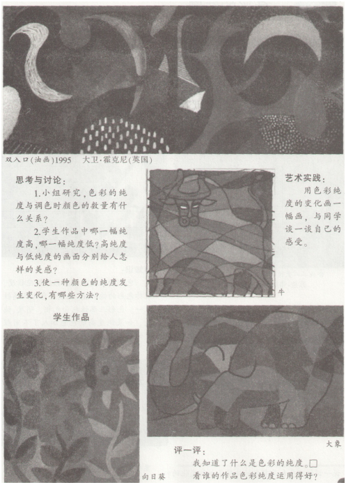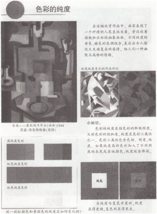 解析 (1)色彩的纯度是指色彩的鲜艳程度,又称色彩饱和度。色彩的纯度是色彩三属性之一,色彩三属性包括色相、纯度、明度。 (2)教学目标 知识与技能目标:了解并掌握色彩纯度知识,尝试用不同的色彩完成一幅美术作品。 过程与方法目标:通过自主探究,尝试运用一些方法改变色彩的纯度。 情感态度与价值观目标:体验动手的乐趣,提高动手实践能力,培养对色彩感受的能力,在学习中提高审美素养。 (3)导入环节 教师收集学生课下收集的秋天校园内的落叶,让学生观察同色系叶子的微妙变化,并请学生上前按照黄色落叶的鲜艳程度进行排列,最后教师总结色彩的鲜艳程度,又称色彩饱和度,揭示课题——《色彩的纯度》。 【设计意图】 激发学生的学习兴趣,并且运用学生自主探究的方式,可以更加直观地让学生感受到色彩纯度的概念,从而为新课教学做铺垫,同时也有利于锻炼学生的观察能力。 (4)教学活动 活动一: 多媒体课件展示两幅纯度不同的作品《合成——豪饮的斗牛士》和《双入口》。 师:在画面中你看到了哪些颜色。并按照同类色进行分组,它们有怎样的不同? 生:红色——暗红色,黄色——土黄色,蓝色——蓝灰色。 教师总结:它们颜色鲜艳程度不一样,即纯度不同。 师:那么不同纯度给你怎样的感受呢? 学生回答。 教师总结:高纯度的作品色彩鲜艳、强烈、活泼,低纯度的作品给人以柔和、平稳、安静、低沉的感觉。 【设计意图】 引导学生体验,初步感受不同的色彩纯度带来的不同感受。 活动二: 师:两幅作品中不同纯度的颜色是怎样调配出来的呢? 教师引导学生分小组进行调色,看谁调出的颜色最多,并告诉大家用什么方法调配出来的,在这个过程中你们发现什么样的规律? 学生练习,教师总结:纯色中分别添加灰色或这个纯色的对比色可以降低色彩的纯度,加入的其他色彩越多,纯度越低。 【设计意图】 学生通过练习,掌握纯度知识和变化规律。 活动三: 教师示范:①简洁地画出一个主题形象;②运用线条进行分割;③选择高纯度或低纯度的色彩进行描绘。 【设计意图】 通过教师示范的教学方法可以更好地突出教学重点,突破教学难点,使学生易于掌握作品创作的方法,掌握纯度变化规律。