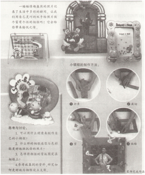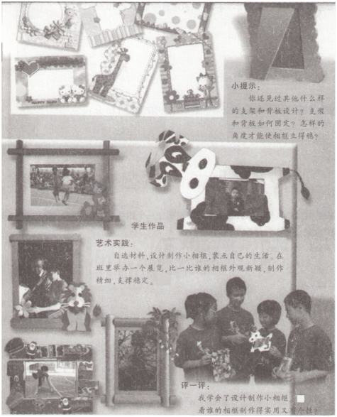 解析 (1)相框的总体结构分成外框、背板和支架三部分。 (2)教学目标 知识与技能目标:了解制作相框的材质、固定背板与支架等相关知识,利用身边材料制作一个美观、实用的小相框。 过程与方法目标:通过自主探究和合作学习,设计并制作一个小相框,提高动手能力。 情感态度与价值观目标:通过制作小相框,体验创作的乐趣,培养创新思维和实践精神,提高动手实践能力,养成对美术学习的持久兴趣。 (3)导入环节 教师:老师这里有一个谜语大家猜猜看,长得平平凡凡,常放桌子上面,把童年放进去,把记忆藏里边。 学生讨论并回答。 教师:有的同学已经猜出来了,谜底就是相框,从而揭示课题《自制小相框》。 【设计意图】 谜语导入激发学生的学习兴趣,为新课的教学做铺垫,顺利地将学生引入学习情境。 (4)教学活动: 活动一: 教师请学生展示课下收集的各种相框。找出自己最喜欢的相框,并说明理由。 教师总结:同学们选取的最喜欢的相框不仅设计新颖、美观,而且实用。 【设计意图】 通过直观欣赏,引发学生兴趣,培养学生的分析、概括能力及语言组织能力。 活动二: 教师引导学生观察这些相框的造型,并让学生说一说相框是由哪几部分构成的? 学生回答.教师总结:相框由外框、背板、支架三部分组成。 教师展示自己制作的小相框。问:大家想一想,这些小相框是用什么材料制作的呢?在我们的生活中还可以用哪些材料制作小相框呢? 学生回答,教师总结:生活中的废旧材料如塑料、毛线、硬纸板、纽扣、贝壳、丝带等都可以用来制作小相框。 【设计意图】 通过欣赏,培养学生认真观察、善于发现的能力,发散学生思维。 活动三: 教师:我看大家都带来了自己最喜欢的照片,下面我们就一起来学习怎样为我们的照片制作一个漂亮的小相框吧! 教师示范制作步骤和方法: 1.用彩色纸或者布料进行折叠组成外框的四个边。 2.分别剪裁四个边框,使之可以自由组合。 3.将四个边框粘贴起来。 4.最后对粘好的外框进行装饰。 教师:外框做好了,那么大家思考一下怎样将相框的背板固定在相框上? 学生分小组自由讨论,并派代表回答。 教师总结:横向支撑、纵向支撑、斜角支撑。 【设计意图】 采用教师示范法的方式进行教学可以更好地突出本课教学重点,突破难点,加深学生对于相框制作方法的理解,为接下来的创作打好基础。 活动四: 教师出示本班拔河比赛的照片.要求学生合理运用自己所带材料设计制作一个尺寸适中、色彩搭配和谐的小相框。 学生动手创作.教师巡视予以指导。 以“小小设计展”的形式展示自己设计的相框,通过学生互评、学生自评、师评等方式,评出“最具创意奖”“最佳实用奖”等。 【设计意图】 通过自己动手创作,培养学生的动手能力。通过学生自评、互评、师评等方式,进行多角度评价。肯定学生的学习成果,培养学生的学习自信,指出问题的同时鼓励学生。