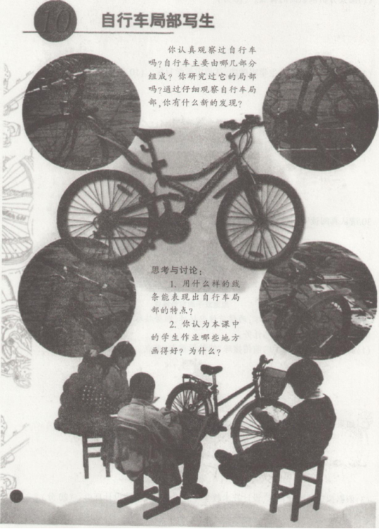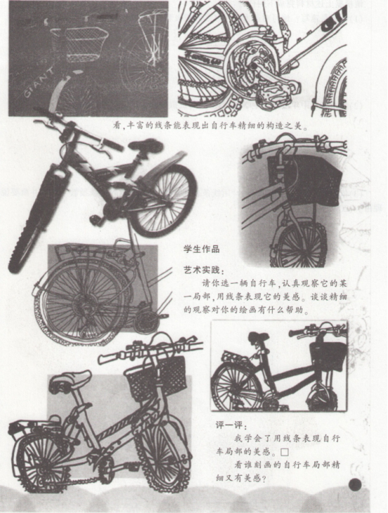解析 (1)速写是一种快速的写生方法,是以线为主的表现形式。速写同素描一样,既是造型艺术的基础,也是一种独立的艺术形式。 速写练习不仅可以锻炼学生的观察能力,而且能培养其绘画概括能力,加深其记忆力和提高默写能力。通过速写练习,学生还可以收集大量的素材,不断地积累速写经验。同时,也培养了学生的创作能力。速写是由造型训练走向造型创作的必然途径。 (2)教学目标 知识与技能目标:通过本课学习,了解自行车的基本结构,掌握以线为主的造型方法;以速写的形式,对自行车的局部进行写生。 过程与方法目标:通过认真观察,教师讲解、分析并示范,锻炼对自行车局部的观察和造型能力以及对生活中物象的观察与表现能力。 情感态度与价值观目标:养成热爱生活、观察生活、从生活中发现美的良好习惯,感受创作的乐趣,体会和发现生活中的美。 (3)教学环节 环节一:提设问题,导入新课 上课开始,教师提问:大家都会骑自行车吗谁能说出自行车上有哪些构造部件 学生踊跃回答,教师就势导入本课《自行车局部写生》。 【设计意图】 运用提问法导入,激发学生的学习兴趣。从学生生活切入。提高学生的学习热情。 环节二:讲授新知,演示新技能教师出示自行车ppt,提问:大家认真观察自行车上的细节,看看各部位有什么不同 学生讨论并回答,教师总结:自行车上的不同部位(车座、车把、车轮、脚蹬、链条等)体现了不同的线条,如车身是直线,车轮是弧线,链条和轮胎花纹是曲线、折线等。 教师讲解,要根据实际观察,体会不同的线条给我们的不同感受。教师示范自行车的局部写生,学生观摩学习如何使用线条来表现自行车的各个部位。 【设计意图】 通过提问,使学生了解自行车的基本结构;通过教师示范,学生可以更加深刻地体会不同线条的表现力,并直观感受、学习如何进行速写写生。 环节三:巩固新知.实践练习 教师示范结束,让大家选择自己想要描绘的自行车局部,运用不同的线来进行实践练习,教师巡回指导。 【设计意图】 通过课堂练习,及时掌握速写写生方法,巩固所学新知。 环节四:展示评价,拓展提高 把大家的练习作品进行展示,通过学生自评、他评、互评、师评等方式,进行多角度评价。肯定学生学习成果,指出不足,鼓励学生。 【设计意图] 对学生的实践成果进行多主体、全方位的评价交流,不仅体现了学生的主体地位,也体现了教师的主导作用。