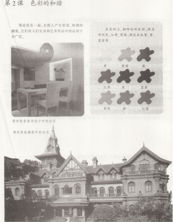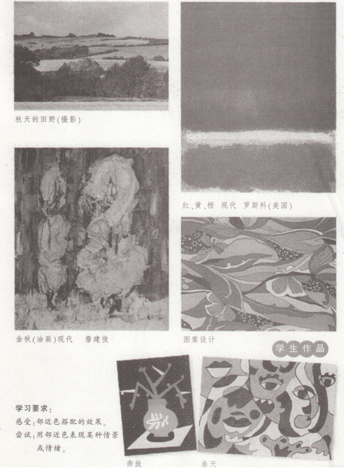 问题 请认真阅读下列材料,并按要求作答。 请根据上述材料完成下列任务: (1)简述同类色与邻近色的区别。 (2)依据该材料,试拟定教学重难点。 (3)设计教学过程,体现出教学重难点并说明设计意图。