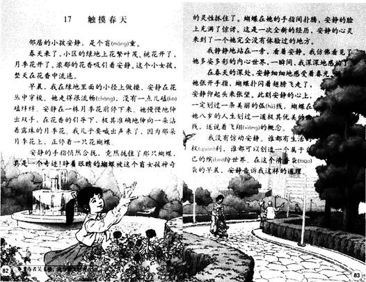 解析 (1)文本分析 本文讲述的是盲童安静流连于春暖花开的美景中,以自己独特的方式,用心灵去感受春天的气息,触摸春天的脉搏,感受春天美好的一个故事。本文通过盲童对生命的热爱,告诉我们每个人都拥有生活的权利,只要你用心去感受生命的美好,就能创造一个属于自己的春天。 (2)教学目标和教学重点 知识与技能目标:认识并能正确读写生字词。正确、流利、有感情地朗读课文,背诵自己喜欢的段落。 过程与方法目标:学习运用联系上下文和生活实际,体会文中含义深刻的句子,并体会其表达的效果,增加语言积累。在多种形式的朗读中体会文章的情感内容。 情感态度与价值观目标:通过体会盲童对生活的热爱,懂得热爱生活,珍惜生命。 教学重点:深入体会文中含义深刻的词句,体味安静的内心世界,感受作者对生命的关爱,感受生命的内涵,懂得珍惜生命,热爱生活。 (3)教学导入 ①同学们喜欢听故事吗那好,听我讲个故事,一个视力正常的人与一个双目失明的人一起走在崎岖的山路上,视力正常的人接连摔了几跤,而双目失明的人走起路来四平八稳。 视力正常的人深感疑惑,于是问盲人:“为什么你看不见路却能够走得如此稳健,我能看到路却不断摔跤呢”盲人不假思索地回答:“因为你有明亮的眼睛,而我什么也看不到。”视力正常的人一听更加疑惑不解了。盲人不慌不忙地接着说:“就是因为你拥有明亮的双眼,能看清楚远方,却也忽略了自己的脚下,对于眼前坎坷的道路还没有看清楚就大步地走了过去,所以一不小心就被绊倒了。而我与你相反,因为看不到路,所以我全神贯注,将脚下的路探清楚后再踏出每一步,因此才走得很平稳,不会摔跤。”视力正常的人听了连连点头。 ②今天我们学习的课文也讲述了一个双目失明的人的故事,题目叫——触摸春天。(板书课题,生读课题) ③读了课题,你们头脑中也许产生了一些疑问,请说一说你们的疑问。(谁触摸春天怎样触摸春天的为什么要触摸春天春天怎么触摸….) 【设计意图】从课题入手,引导质疑,可以充分调动学生与文本进行对话的积极性和主动性,可以激发学生的阅读欲望,形成阅读期待,为本文的学习奠定一个良好的基础。