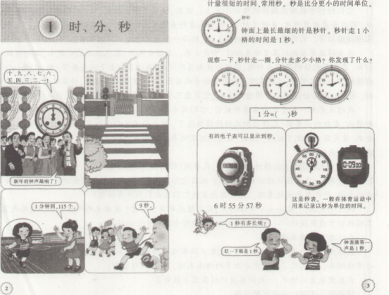 解析 (1)通过本课教学,可以促进学生知识技能、数学思考、问题解决和情感态度四个方面的发展。 知识技能:通过参与综合实践活动,理解1秒、1分的时间观念,积累综合运用数学知识、技能和方法解决简单的数学活动的经验。 数学思考:在体会和理解1秒、1分的时间观念的过程中,学会独立思考,体会数学的思想和思维方式,并能够清晰地表达自己的想法。 问题解决:通过体会和理解1秒、1分的时间观念,能够解决与之相关的实际问题,提高应用意识,提高实践能力。 情感态度:在参与数学活动中产生对数学的好奇心与求知欲,体会数学的特点,了解数学的价值。 (2)教学目标 知识与技能目标:学生能够知道时间单位——秒,理解1分=60秒,体会1秒在实际生活中的应用。 过程与方法目标:通过观察、体验等实践活动,学生能够正确理解1分、1秒的时间观念。 情感态度与价值观目标:学生能够感受到数学知识与生活实际的密切联系,在此基础上懂得应该珍惜时间、时间宝贵等观念。 (3)导入环节设计 教师播放跨年晚会中观众数倒计时的影像,引出本课课题:同学们,"新年的钟声就要响起,让我们和观众们一起倒计时:“十、九、八、七、六、五、四、三、二、一!” 师:当时间较短时,我们常用秒,秒是比分还要短的时间单位,这节课我们先来学习秒。再去看看秒和分、时都有什么样的关系。 板书:秒分时 【设计意图】 通过学生熟悉的生活场景引出课题,激发学生的学习兴趣和热情,并且在导入环节让同学们数倒计时,体会秒的时间观念
