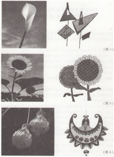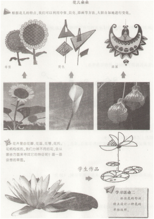 解析 (1)单独纹样是指没有外轮廓及骨格限制,可单独处理、自由运用的一种装饰纹样。这种纹样的组织与周围其他纹样无直接联系,但要注意外形完整、结构严谨,避免松散零乱。单独纹样可以单独用作装饰,也可用作适合纹样和连续纹样的单位纹样。 (2)教学目标 知识与技能目标:了解花儿的特点,领悟其变化的方法,学会用画的方法表现花儿的形象。 过程与方法目标:通过赏析图片了解花卉的结构,根据花的种类了解其特征,并学会设计单独纹样。 情感态度与价值观目标:通过本课学习提高观察与概括能力,养成勤于动脑的好习惯。 (3)教学过程 环节一:设置情境,导入新课 教师播放音乐的同时展示各种花卉图片,引导学生赏析。 教师引导观看并引出课题:自然界中最为争奇斗艳的莫过于鲜花,形形色色的花朵总是给我们带来愉悦或惊喜,今天我们也要用灵巧的双手来创造出美丽的花朵——花儿朵朵。 【设计意图】 通过音乐与图片结合的方式导入课题,简洁明了,更加直观地展现本课内容,调动学生积极性。 环节二:欣赏分析,观察探索 教师展示一些花卉纹样的作品,引导学生赏析,并思考问题:说一说它们运用了怎样的表现形式? 学生回答。 教师总结:绘画形式、剪贴形式。 教师继续将作品分发到各个小组,引导学生赏析,并观察花卉结构。 小组观察并交流。 教师总结:花卉是由花瓣、花蕊、花萼、花托、花柄构成的。 【设计意图】 为了更好地认识花儿的结构,引导学生主动探究、体验学习的过程。 环节三:实践练习,展示评价 ①教师引导学生赏析向日葵、百合花等图片并分析其结构。 继续展示对比图片,引导观赏,并思考:图一、图二和图三分别运用了怎样的方式进行变化? 学生交流回答。 教师总结:根据花儿的特点,我们可以利用夸张、简化、添画等方法进行变化。(单独纹样) 教师继续提问:这些纹样的用途是什么? 学生思考回答。 教师总结:单独纹样可以单独用作装饰,也可用作适合纹样和连续纹样的单位纹样。 ②学生实践.展示评价 a.教师提出作业要求:根据花儿的特征设计一种单独纹样。 教师巡视指导,学生实践创作。 b.组织学生组内欣赏,评出最佳设计奖,进行作品展示。 【设计意图】 为了更好地体现本堂课的重难点,展示对比图片,引导学生观察不同,使学生自主学习、主动探索。 环节四:小结作业 展示花卉连续纹样的图片,引导学生课后探究连续纹样的制作方法。 【设计意图】 通过课后作业的形式培养学生自主学习、主动探究的意识。
