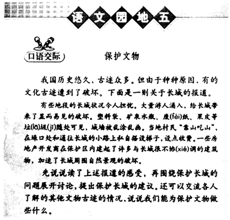 解析 (1)语文课程是一门学习语言文字运用的综合性、实践性课程。义务教育阶段的语文课程应使学生初步学会运用祖国语言文字进行交流沟通,吸收古今中外优秀文化.提高思想文化修养,促进自身精神成长工具性与人文性的统一是语文课程的基本特点。口语交际教学本身就致力于提高学生的表达能力,这是语文课程实践性的要求。“保护文物”这一主题的设置不仅有利干增强学生对我国悠久历史文化的了解,感受优秀文化的熏陶,更能引导学生形成痛惜文物惨遭破坏进而珍爱保护文物的责任感,使学生能在生活中践行优秀的精神文化,促进其自身精神品质的健康成长。 (2)教学目标 知识与能力目标:能简要谈谈文物保护的现状,交流关于保护文物的个人感受;能以“保护文物"为主题,结合个人的相关见闻,提出保护文物的措施或建议。 过程与方法目标:联系生活经验,开展小组合作讨论,分条说出保护文物的具体做法。 情感态度与价值观目标:激发了解中国文物古迹的兴趣,形成并提高保护文物意识,树立“保护文物,人人有责,从我做起,从小处做起”的观念。 (3)课堂提问设计 ①教师展示长城绵延数里的壮景图片以及遭到破坏后的图片和相关报道,提问:同学们在对比图片之后,有什么样的感受?请大家谈一谈。 【设计理由】 通过直观展示不同方面的、充满反差感的资料,让学生在为长城感到骄傲、对长城充满向往的同时,深刻感受到长城不容乐观的现状,产生为之痛惜与担忧的情感,从而自觉形成保护长城的强烈意识,为后续开展口语交际活动热身。 ②教师出示关于保护长城措施多方的相关资料,提问:对于保护长城,结合生活经验,你有什么样的意见或建议呢?请思考并与组内其他成员展开讨论。 【设计理由】 教师初步出示与保护长城措施有关的资料,引导学生结合个人生活经验进行思考.既有助于锻炼和提升学生的思维能力,又能够通过组内的交流与讨论增强个人的语言组织表达能力,强化学生的合作意识与合作能力。 ③提问:除了长城,你还了解到有哪些文物古迹正在遭受破坏或者已经被破坏?请谈一谈你了解到的情况并与小组成员共同设计几条关于文物古迹保护的宣传标语。 【设计理由】 展示学生搜集资料的能力并有效拓展课堂教学资源,注重语文与生活的联系;提升学生倾听他人、表达自我的能力;通过小组合作设计宣传标语,进一步强化学生的合作意识并尊重语文实践性的特点,使学生的表达与写作能力在合作中得到综合发展。