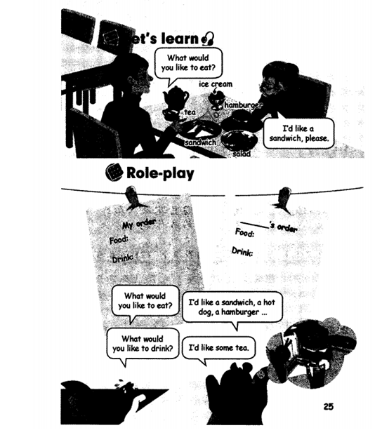 解析 (1)可以利用联想记忆、谐音记忆和利用卡片进行记忆。 首先,联想记忆是因为小学生对形象直观的事物比较感兴趣,把单词联想成生活中常见的一些事物能帮助学生记忆。如eye把两个e想象成两只眼睛,把y想象成鼻子。 其次,谐音记忆也可以帮助学生快速地记住单词,例如pest是害虫,一想到害虫我们都想到“拍死它”,这个谐音和单词的读音很像。 最后,卡片记忆法就是将单词整理写在卡片上,可供随时翻阅并加以记忆。这种方法的特点是简单实用并易于携带,不受时间和空间的限制,可随时随地随用。这样不仅可以寓学于乐,而且还可以大大提高对课余时间的合理有效利用。 除此之外还要注意及时巩固。艾宾浩斯遗忘曲线表明,遗忘规律是先快后慢,建议学生在刚学完单词之后多记忆,以免遗忘。 (2) Teaching Aims Knowledge aim: Students can read,write and memorize the words: ice cream, hamburger, tea, Sandwich, Salad. Ability aim: Students can use the words to order food in a restaurant. Through the activities and games,Students’ ability of listening and speaking can be improved. Emotional aim: Students can get to know more about the healthy eating style, and know the eating custom in Eastern country. (3)巩固练习活动 ① Guessing game Prepare some cards of food, and then use some words to describe them and ask students to guess the food, and find them in the cards and then paste them on the blackboard,teacher pasting them on the blackboard, teacher shows them the right answer on the blackboard. T: The first one is Chinese food. We often eat it with the vegetables and meat. What’s this? You, Please. Ok, he chooses the rice card. Please paste it on the blackboard. Everybody look at he PPT. The answer is rice! You are right. After pasting all the cards on the blackboard, ask students to listen carefully, and then read the words at random, and after saying it for the first lime, ask some of them to come to the blackboard to show me right order to the students. T: Listen to me carefully, hamburger, Sandwich, tea, rice,cake. Ok, Who can come to the blackboard and show me the right order? Ok, you Please. T: Right, let’s have a check. The order is:hamburger, sandwich, tea, rice, cake. 【设计意图】 利用一个猜谜游戏来检验学生是否真的掌握了所学的新知识,同时也起到了巩固作用。 ② Role-Play Write the foods and drinks on a paper, and use it as a menu. Teacher acts as the waiter, Students act as the guest. Teacher makes dialogue with students. T: What would you like to eat? S: I’d like a sandwich. After making the dialogue with the students, ask them to practice the sentences with their partner, and then ask some of them to show it to the class. 【设计意图】 设计情景表演的活动,可以很好地帮助学生记忆新知识,同时也可以锻炼学生的英语口语表达能力。