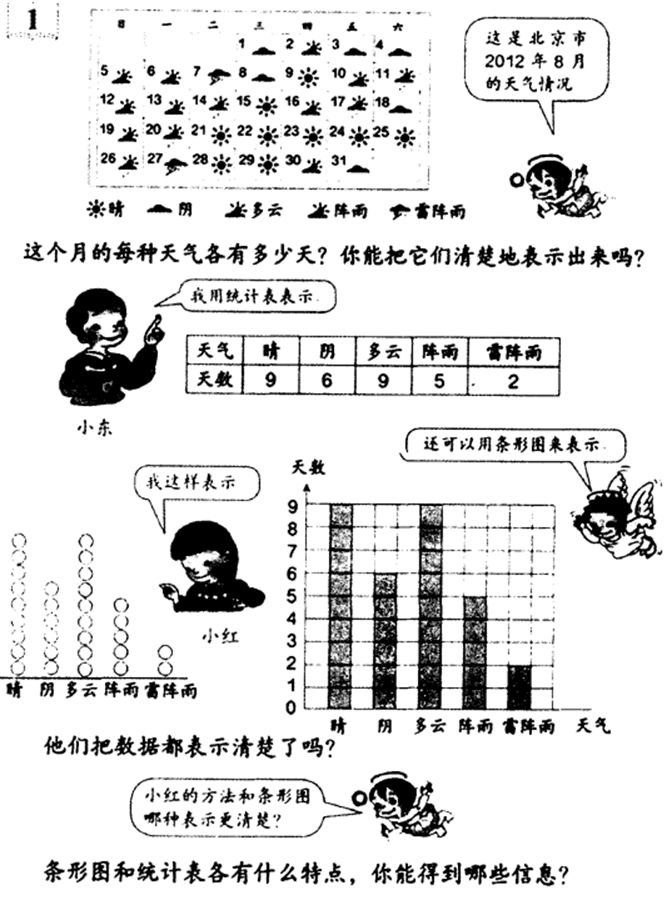 解析 (1)数据分析观念包括:了解在现实生活中的许多问题应当先做调查研究,收集数据,通过分析做出判断,体会数据中蕴涵着信息;了解对于同样的数据可以有多种分析的方法,需要根据问题的背景选择合适的方法;通过数据分析体验随机性,一方面对于同样的事情每次收集到的数据可能不同,另一方面只要有足够的数据就可能从中发现规律。 数据分析的观念可以从三方面来体现,一是体会数据中蕴涵着信息;二是根据问题的背景选择合适的方法描述;三是通过数据分析体验随机性。 (2)教学目标 知识与技能目标:初步体验数据的收集、整理、描述和分析的过程,会用一格表示一的条形统计图来表示数据。 过程与方法目标:通过观察、比较,初步认识条形统计图的结构特点和优势,发展数据分析观念。 情感态度与价值观曰标:通过数据的收集、描述、分析等问题的提出,培养问题意识,体会数学知识与实际生活的紧密联系,提高学习兴趣。 (3)教学环节 (一)导入新课 课件出示2012年8月北京市的天气情况图。引导学生认识和了解表示天气的各种图例。 师生交流后,提问,这是北京市2012年8月的天气情况,这个月的每种天气各有多少天?怎样才能把它们清楚地表示出来? 启发引导学生思考并整理数据:用什么方法统计? 生:小组合作交流,尝试用自己喜欢的方式来统计数据(数数、画√、写正字等),组织汇报交流。 教师根据学生汇报的情况逐一评价。 【设计意图】 通过创设参与北京2012年8月天气情况的调查教学情境,让学生亲身经历数据的收集、整理和处理的过程。在合作互助的学习氛围中,提高学生学习的兴趣、探究的积极性。 (二)探究新知 提问:通过数数的方式我们已经知道每种天气各有多少天,那如何清楚地将它们表示出来呢? 组织学生分小组讨论,并组内完成。 小组1:可以用统计表来表示,将统计得到的数据填入表中方便查找。 提问,从这张表中你能得到哪些信息?用统计表表示数据有哪些好处? 小组2:还可以用图形来表示统计结果。 提问:用图形来表示统计结果有哪些优点?是否存在不足? 【设计意图】 通过创设人人都参与的课堂氛围,充分挖掘学生的潜能,尊重学生个体的选择.鼓励学生用自己喜欢的方式描述统计结果,进行有个性的探究活动。 课件出示条形统计图。 观察统计图有什么特点? (介绍横轴、纵轴、单位长度) (教师边讲解边演示:将不同的天气数量在图中涂上颜色表示出来。 ) 提问:比较分析哪种图表将数据表示的更清楚?统计图和统计表各有什么特点? (组织小组内合作交流) 教师总结:这三种方法都能表示出2012年8月北京市的天气情况.但用统计图的方法来记录统计数据可以更直观地表示数量的多少。 像这样用条形的长短来表示数量多少的统计图,我们把它叫作条形统计图。条形统计图一般由标题、日期(可以省略)、单位名称、条形、横轴、纵轴等组成。 【设计意图】 学生通过亲手操作获得处理信息的方法,体会统计图和统计表的不同特点,有利于培养学生的问题意识和能力的提高。 (三)深化概念 提问:条形统计图的横轴和纵轴分别表示什么? (横轴表示要统计的内容,纵轴一般表示数量) 【设计意图】 通过探究用条形统计图来表示2012年8月北京市天气情况的整理、描述、分析过程,明晰各组成部分的作用,以提问的方式进行强化的同时,总结归纳。 (四)应用新知 统计本班同学的出生月份,并用条形统计图表示出来。师生共同完成,小组合作展示。 【设计意图】 将新授知识与学生生活实际相结合再一次激发了学生的学习兴趣,学生在积极参与中,经历了收集、整理数据的过程。通过对自己收集、整理和分析数据的过程,学生体会到统计的必要性,再次体现了“教学来源于生活,应用于生活”的新理念。 (五)小结作业 教师,通过今天的学习大家都收获了什么?想想是怎么得到的.你又从中学到了什么? 作业:对自己感兴趣的内容进行统计,进行数据分析,设计一个条形统计图。 【设计意图】 小结部分通过学生总结,不仅可以提高学生的总结概括能力,也可以让教师获得学生及时的学习反馈。让学生对自己感兴趣的内容进行数据分析制作条形统计图.使学生明白统计知识是为现实生活服务的。