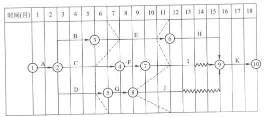 某公司中标某沿海城市一栋办公楼工程,该公司进场后,给整个工程各工序进行划分,编制双代号时标网络图,并根据6月底、11月底进度检查实际情况,在网络图中标出两...