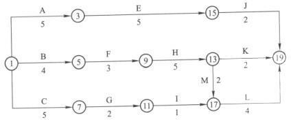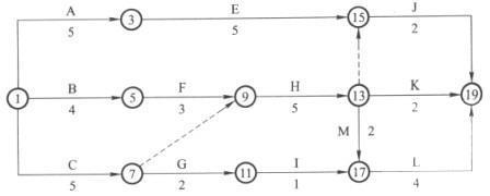 某工程项目合同工期为18个月,施工合同签订以后,施工单位编制了一份初始网络计划,如下图所示。由于该工程施工工艺的要求,设计计划中工作C、工作H和工作J共用...