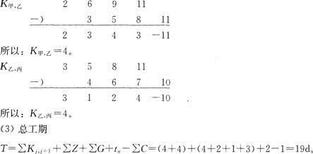 解析 1.根据工程特点,该工程只能组织无节奏流水施工。除此之外,常用的组织方式还有:等节奏流水施工、异节奏流水施工。 2.求各施工过程之间的流水步距: 1)各施工过程流水节拍的累加数列: 甲:26911; 乙:35811; 丙:46710。 2)错位相减,取最大值得流水步距: 流水施工计划图如下所示: