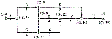 解析 用标号法计算工期如下图所示, 由图可知,计划工期为29个月,能够满足合同工期要求, 关键线路为:①→②→③→⑤→⑥→⑦→⑧,则关键线路即为重点控制施工线路。 线路上所有工作的持续时间总和称为该线路的总持续时间。总持续时间最长的线路称为关键线路,关键线路的长度就是网络计划的总工期。由网络计划图知:关键线路为①→②→③→⑤→⑥→⑦→⑧, 总工期=3 + 5 + 4 + 6 + 11 =29(月),施工总承包单位应当重点控制关键线路上的工作。