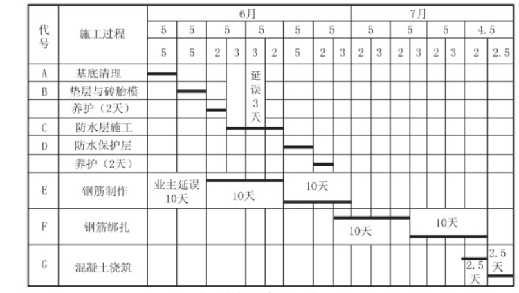 某工程基础底板施工,合同约定工期50天,项目经理部根据业主提供的电子版图纸编制了施工进度计划(如图1)。底板施工暂未考虑流水施工。 图1 施工进度计划图...