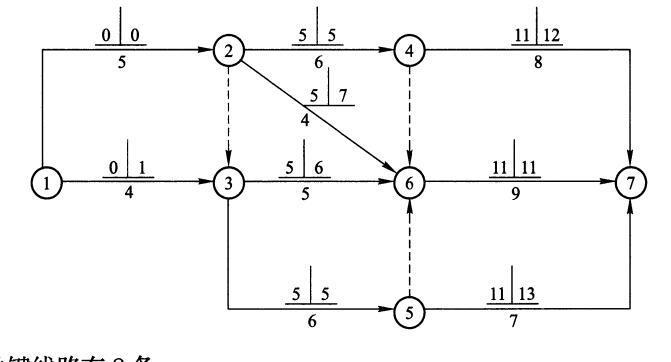 某工程双代号网络计划如下图所示,图中已标出每项工作的最早开始时间和最迟开始时间,该计划表明( )。 A、关键线路有2 条 B、工作①→③与工作③→...