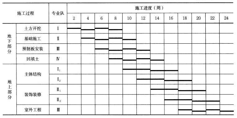 解析 (1)适用等节奏流水施工。施工过程:N = 4;施工段数:M = 4;流水步距:K = 2 周;工期T地下=(M + N-1)×K =(4 + 4-1)×2 = 14 周。(2)适用成倍节拍流水施工。施工过程:N = 3;施工段数:M = 4;流水步距:K = min(4,4,2)= 2 周;专业队数:b1 = 4/2 = 2;b2 = 4/2 = 2;b3 = 2/2 = 1;总队数N' = 2 + 2 + 1 = 5。工期T地上=(M + N′-1)×K =(4 + 5-1)×2 = 16 周。(3)最大限度的搭接时间,即最早的施工段地下部分最后一个施工过程完成后,迅速开始此施工段地上部分后续施工。此时其他施工段地下部分仍继续施工,这一段时间即为最大限度的搭接时间。地下部分最后的施工过程为回填土,回填土施工过程在四个流水段上的流水节拍为:2 周、2 周、2 周、2 周,其中第一个施工段施工2 周结束后,即开始进入地上部分施工,故最大限度搭接时间为剩余三个施工段施工时间:2 + 2 + 2 = 6 周。(4)当第一幢地下工程完成后即可进行地上工程,则总工期应按如下式计算:T =(T地下-搭接时间)+ T地上=(14-6)+ 16 = 24 周;工程整体施工进度计划如下图所示: