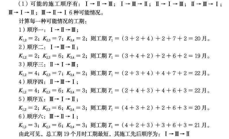 问题 背景 某群体工程由三个独立的单体建筑组成,每个单体均有如下四个施工过程:基础、主体结构、二次砌筑、装饰装修。现拟考虑以每个单体作为一个施工段,四个施工过程采用四个作业队组织无节奏流水施工。各单体结构形式、工程体量设计均不同,根据施工产量定额计算出三个单体各施工过程所需施工时间如下表所示。 图} 2.问题(1)三个单体施工先后顺序没有其他条件限制,请找出总工期最短时其施工先后顺序。(2)按此方案绘制流水施工进度计划。{