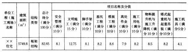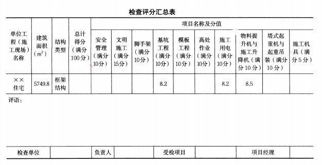 解析 (1)建筑工程施工安全检查还应包括:检查设备设施、教育培训、操作行为、劳动防护用品使用和伤亡事故处理。(2)建筑工程施工安全检查的主要形式还应包括:经常性安全检查、季节性安全检查、节假日安全检查、开工、复工安全检查、专业性安全检查和设备设施安全验收检查等。(3)建筑工程施工安全检查的要求还应补充:1)认真、详细做好检查记录,特别是对隐患的记录必须具体,如隐患的部位、危险性程度及处理意见等。2)检查中发现的隐患应发出隐患整改通知书,责令被查单位整改,并作为整改后备查依据。3)尽可能系统、定量地做出检查结论,进行安全评价。4)检查后应对隐患整改情况进行跟踪复查,查被检单位是否按“三定”原则(定人、定期限、定措施)落实整改,经复查整改合格后,进行销案。(4)建筑工程施工安全检查常用方法还有:量 、测、“现场操作”。(5)汇总表中各项分数计算如下:1)分项实得分=(该分项在汇总表中应得分×该分项在检查评分表中实得分)/100;则:“安全管理”分项实得分为:10×81/100 = 8.1 分;“模板工程”分项实得分为:10×86/100 = 8.6 分;“高处作业”分项实得分为:10×79/100 = 7.9 分;“塔式起重机与起重吊装”分项实得分为:10×82/100 = 8.2 分;“施工机具”分项实得分为:5×82/100 = 4.1 分。2)在汇总表的各项分项中,如有多个检查评分表分值时,则该分项得分应为各单项实得分数的算术平均值。脚手架实得分为:(82 + 80)/2 = 81 分;换算到汇总表中的分值为:10×81/100 = 8.1 分。汇总表中“文明施工”分项实得分为:15×85/100 = 12.75 分。3)本工程总计得分为:8.1 + 12.75 + 8.1 + 8.2 + 8.6 + 7.9 + 8.2 + 8.5 + 8.2 + 4.1 = 82.65 分。4)汇总表结果如下: