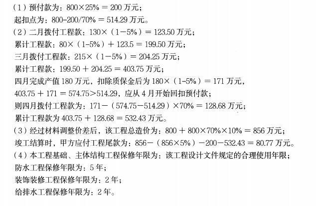 问题 背景 某施工单位通过竞标获得了某工程项目。甲、乙双方签订了有关工程价款的合同,其中包含如下主要内容:(1)工程造价为800 万元,主要材料费占施工产值的比重为70%;(2)预付备料款为工程造价的25%;(3)工程进度逐月计算;(4)工程保修金为工程造价的5%,从逐月工程款中扣除,待保修期满后一次性返还;(5)材料价差调整按规定进行,最后实际上调各月均为10%,竣工结算时一次性支付。各月完成的实际产值如下表所示: 竣工验收时,发现原合同中未约定工程保修年限,甲方经与乙方协商,双方同意按相关规定中的最低保修年限作为本合同的保修年限执行。 2.问题(1)该工程的预付款、起扣点为多少(精确到小数点后两位)?(2)该工程2~4 月,每月拨付的工程款是多少?累计工程款多少?(3)5 月份办理工程竣工结算时,该工程总造价是多少?竣工结算时,甲方应付的工程尾款是多少?(4)试给出本工程基础、主体结构、防水、装饰装修、给水排水工程等的合理保修年限各为多少?