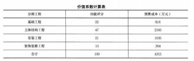 解析 (1)提高价值的途径:按价值工程的公式V = F/C 分析,提高价值的途径有5 条:1)功能提高,成本不变;2)功能不变,成本降低;3)功能提高,成本降低;4)降低辅助功能,大幅度降低成本;5)功能大大提高,成本稍有提高。(2)价值分析对象应以下列内容为重点:1)选择数量大、应用面广的构配件;2)选择成本高的工程和构配件;3)选择结构复杂的工程和构配件;4)选择体积与重量大的工程和构配件;5)选择对产品功能提高起关键作用的构配件;6)选择在使用中维修费用高、耗能量大或使用期的总费用较大的工程和构配件;7)选择畅销产品,以保持优势,提高竞争力;8)选择在施工(生产)中容易保证质量的工程和构配件;9)选择在施工(生产)难度大、多花费材料和工时的工程和构配件;10)选择可利用新材料、新设备、新工艺、新结构及在科研上已有先进成果的工程和构配件。(3)计算分部工程的评价系数、成本系数和价值系数,详见下表: