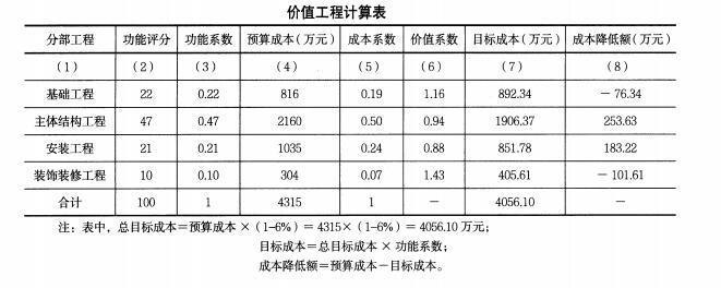 问题 背景 某项目施工过程中,项目经理部为了降低项目成本将工程划分为:基础工程、主体结构工程、安装工程、装饰装修工程,并对其功能进行评分,根据项目合同和施工图纸,得出预算成本,详见下表。根据项目所属的企业要求该项目经理部在项目管理过程中成本降低率为6%,所以项目经理部计划采用价值工程方法寻求降低成本的途径和措施。 2.问题(1)从价值工程原理可得到哪些提高价值的途径?(2)价值工程中,选择价值分析对象重点有哪些?(3)计算各分部工程的功能系数、成本系数、价值系数、目标成本、成本降低额(保留到小数点后两位数),并填入下表。