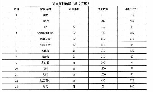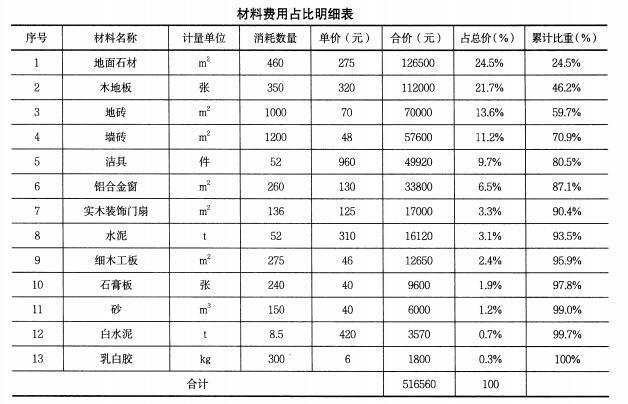 解析 (1)按照各材料占总价百分比的多少,对各材料进行排序,并按其价值计算各材料在总价值中的累计比重,详细计算结果见下表: 由此可见:1~5 项材料(地面石材、木地板、地砖、墙砖、洁具)累计比重占80.5%为A 类材料;6~7 项材料(铝合金窗、实木装饰门扇)累计比重占80.5%~90.4%,为B类材料;其余材料为C 类材料(一般材料)。(2)A 类材料(主要材料、大宗材料)项目经理部编制材料需要量计划,由企业物资部门统一采购,按计划供应给相应项目经理部并重点管理;B 类和C 类材料应由项目经理部编制采购计划并按实际情况进行管理。