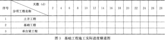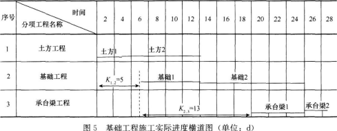 解析 1.基础工程网络计划的关键线路为:①→②→③→④→⑤→⑥,该基础工程计划工期为:3+7+7+3=20d。2.施工总承包单位是否可以提出工期索赔的判断以及理由如下: 事件1:施工总承包单位可以提出工期索赔,索赔工期为:6-4=2d。 理由:由于发现局部基础地基持力层为软弱层需处理属于施工总承包单位不可预见的,因此可以提出工期索赔,虽然土方2不是关键工作,但是延误的工期6d已超过其总时差4d,因此可以提出工期索赔。 事件2:施工总承包单位不可以提出工期索赔。 理由:虽然基础施工钢材由建设单位供应,因施工用钢材未按时进场导致工期延期3d,理应由建设单位承担责任,但是承台梁1不是关键工作,且总时差为4d,延期的3d未超过其总时差,所以不可以提出工期索赔。 事件3:施工总承包单位不可以提出工期索赔。 理由:基础2施工工期延期5d是由施工总承包单位原因造成工程质量事故返工导致的,属于施工总承包单位应承担的责任,虽然基础2属于关键工作,但也不可以提出工期索赔。 3.对索赔成立的事件,总工期可以顺延2d。 实际工期为:3+9+12+3=27d。 4.上述事件发生后,本工程网络计划的关键线路发生了改变,新的关键线路为:①→②→④→⑤→⑥。 绘制施工实际进度横道图如图5所示: