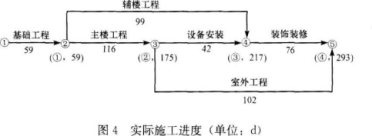 解析 1.该网络计划中,主要控制对象有基础工程、主楼主体工程、设备安装工程、装饰装修工程。计划工期为41周。2.上述各事件中,乙方能否向甲方提出工期及费用索赔的判断及理由如下: (1)事件1:可提出费用和工期索赔。因为地质条件变化是甲方应承担的责任。由此产生的费用及关键工作工期延误都可以提出索赔。 (2)事件2:可提出费用索赔。因为乙方费用的增加是由甲方原因造成的,可提出费用索赔;而该项关键工作的工期延误不会影响到整个工期,不必提出工期索赔。 (3)事件3:不应提出任何索赔。因为乙方的窝工费及关键工作工期的延误是乙方自身原因造成的。 (4)事件4:不应提出索赔。因为室外工程管线材料质量不合格是乙方自身的原因造成的,由此产生的费用和工期延误应由自己承担。 (5)事件5:不应提出任何索赔。因为乙方采取的加快施工的技术措施是为赶工期做出的决策,属于自身原因。 3.综上所述,事件1、事件2可进行工期索赔。基础工程是关键工作,延长3d,可获得3d的工期补偿;辅楼工程延长1d,但它不是关键线路,且有8周的总时差,所以,不能获得工期补偿。故乙方可得到的工期补偿为3d。 如图4所示,经计算实际工期为293d,工期罚款为:[293-(41×7+3)]×2500=3×2500=7500元。 4.乙方应得到的索赔款为:(15×18+40×30+50000+20000)×(1+30%)=92911元。